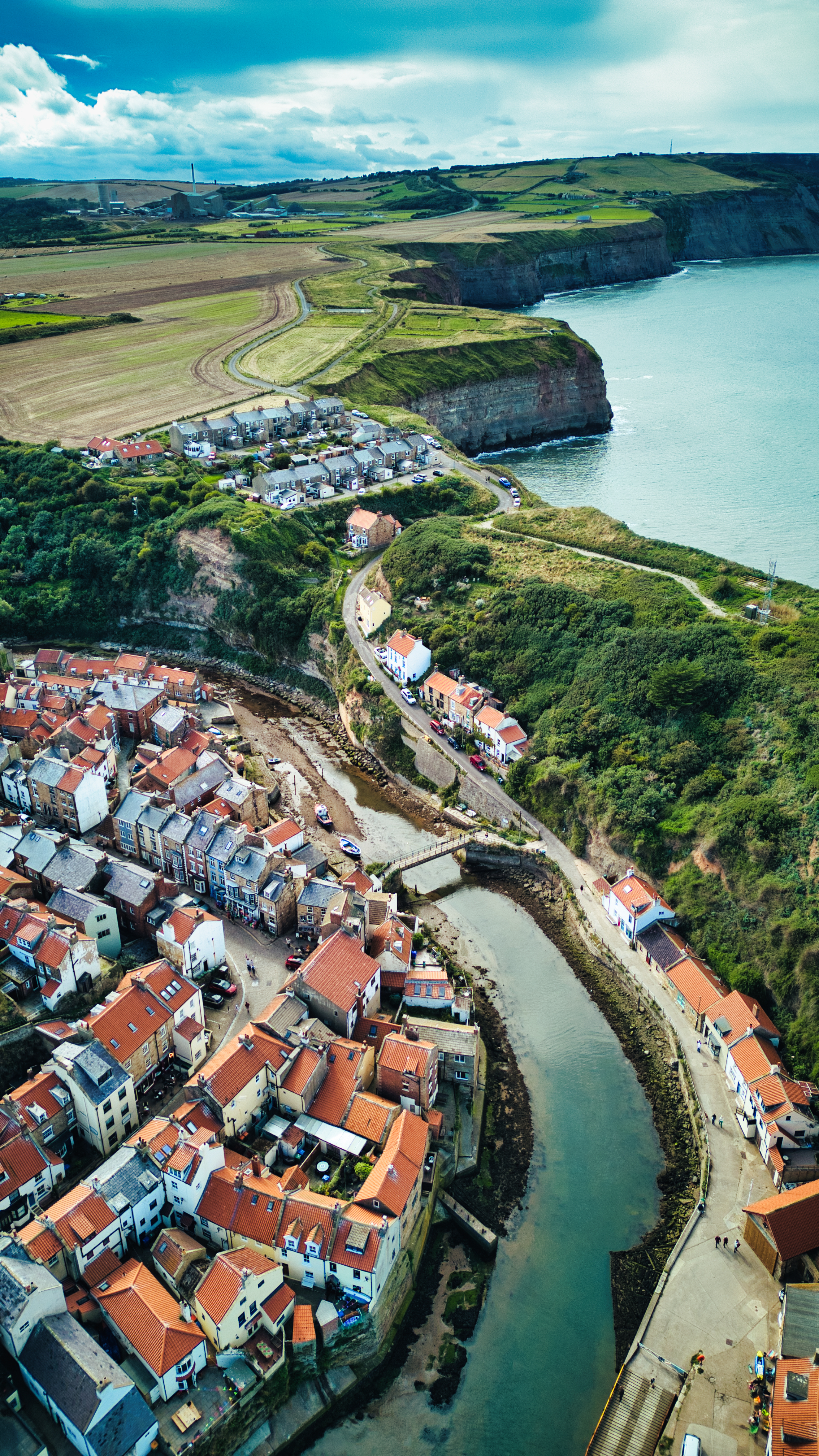 Aerial view of a coastal village with river, cliffs, and cultivated fields under a cloudy sky in Staithes, England.