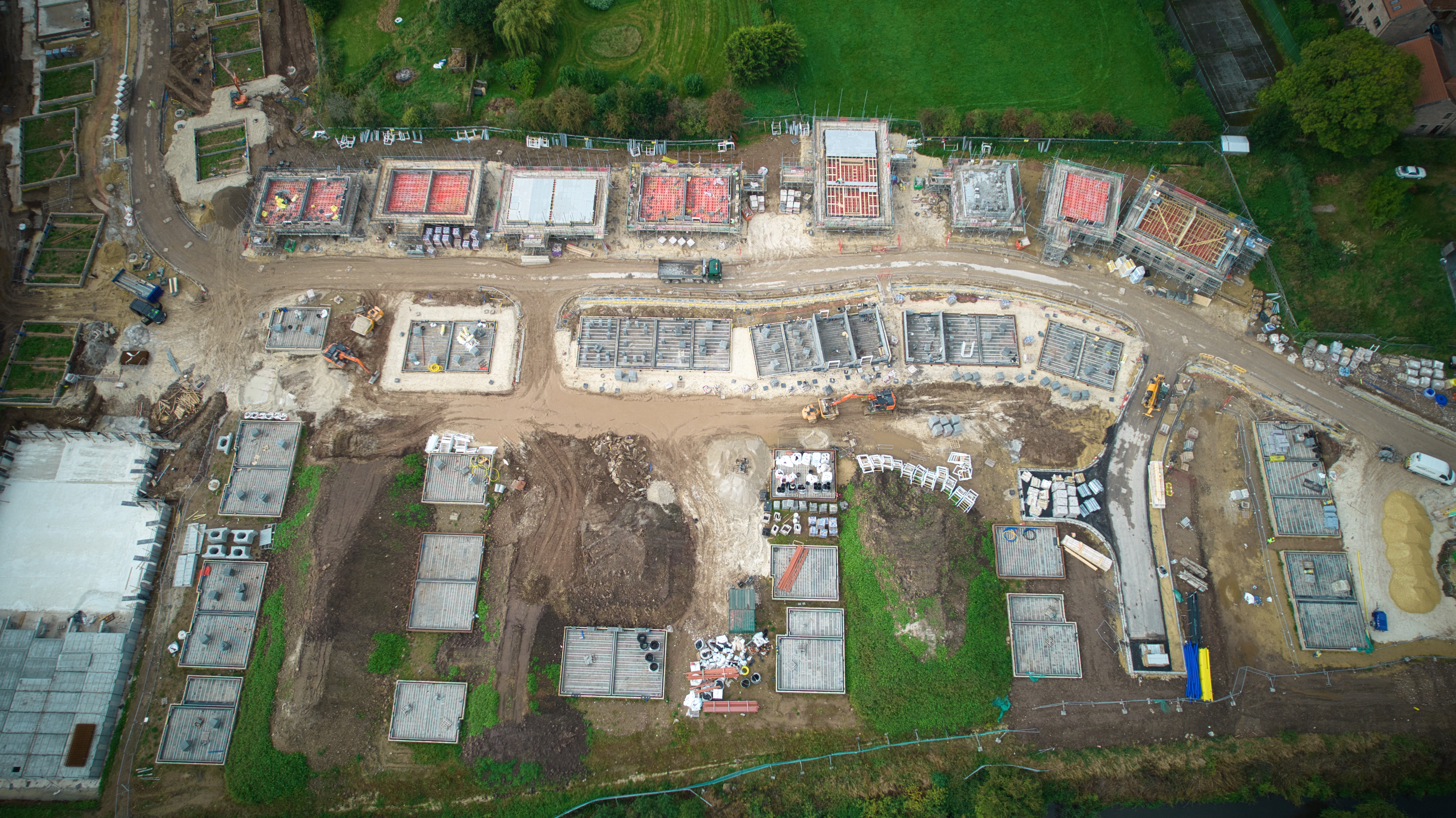 Aerial view of a construction site with building foundations and machinery, surrounded by greenery.