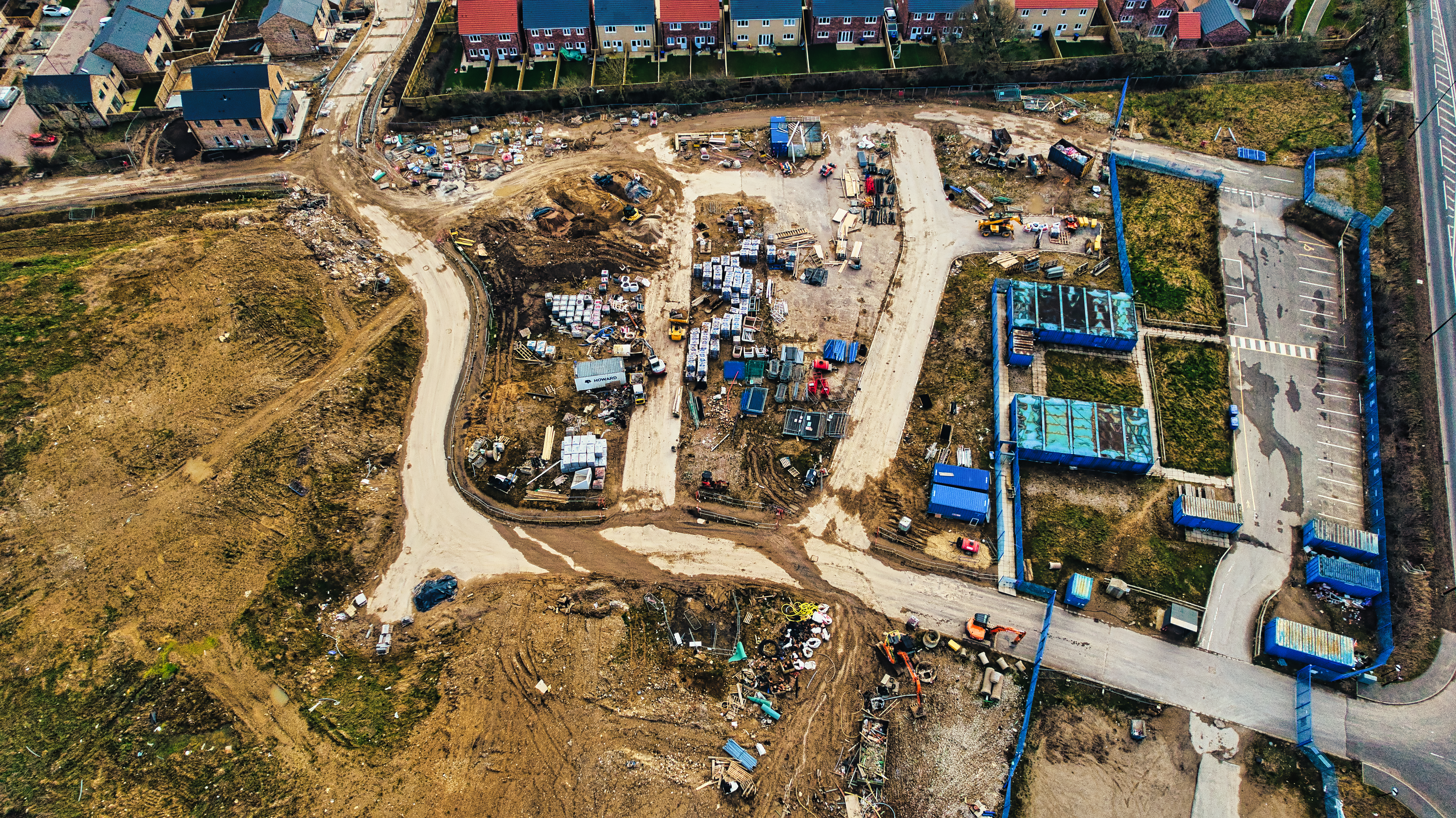 Aerial view of a construction site with buildings and equipment, surrounded by roads and houses in Harrogate, North Yorkshire.