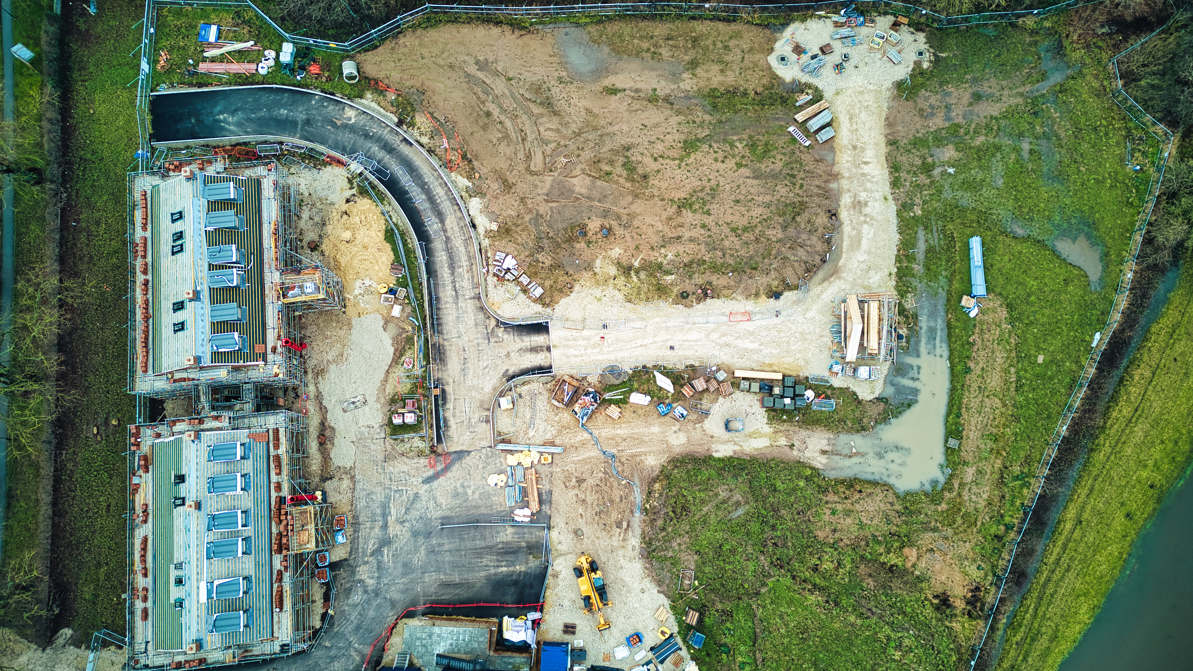 Aerial view of a construction site with excavated land, machinery, and materials, surrounded by greenery.