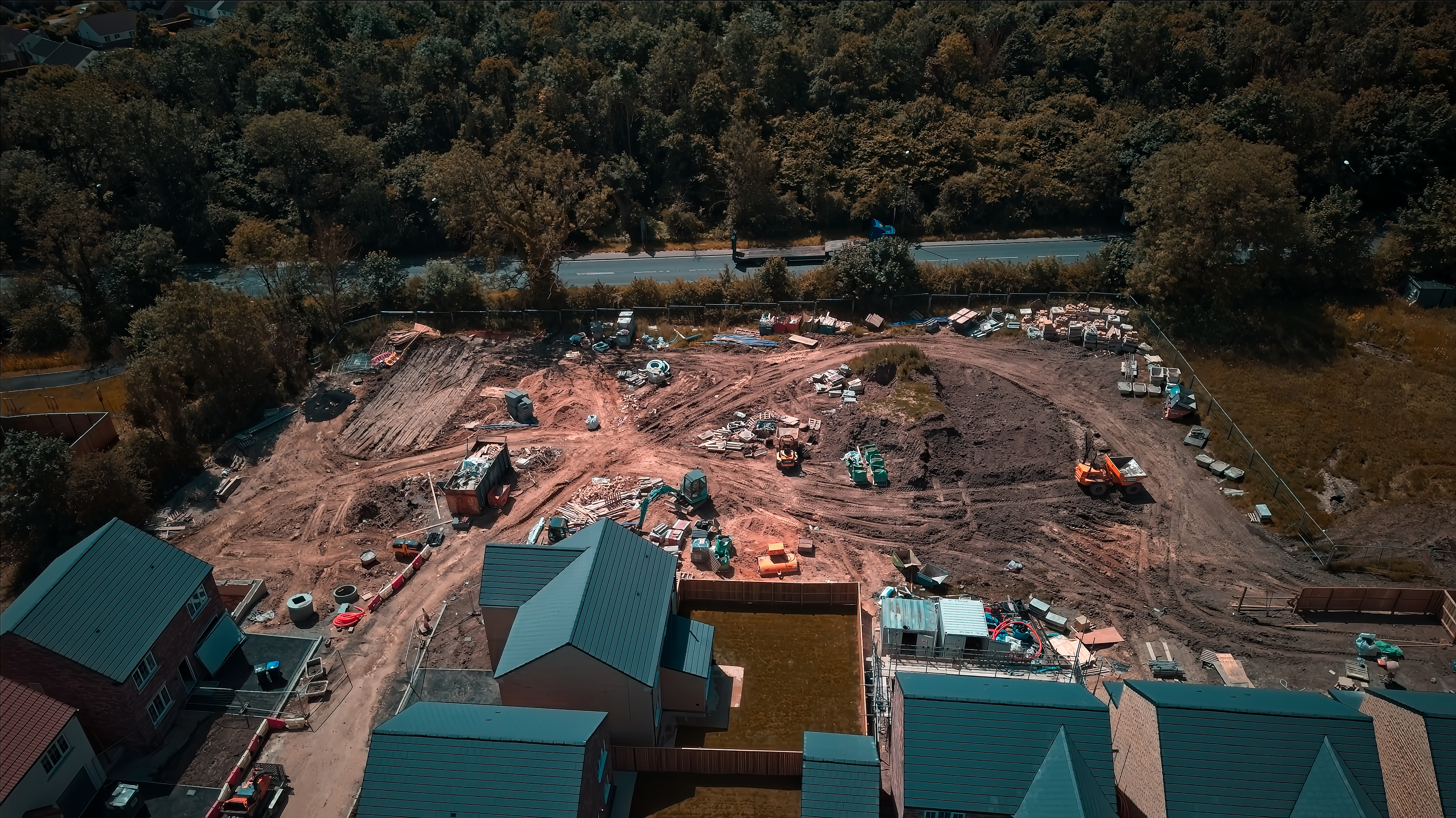 Aerial view of a construction site with houses being built, surrounded by trees and a road.