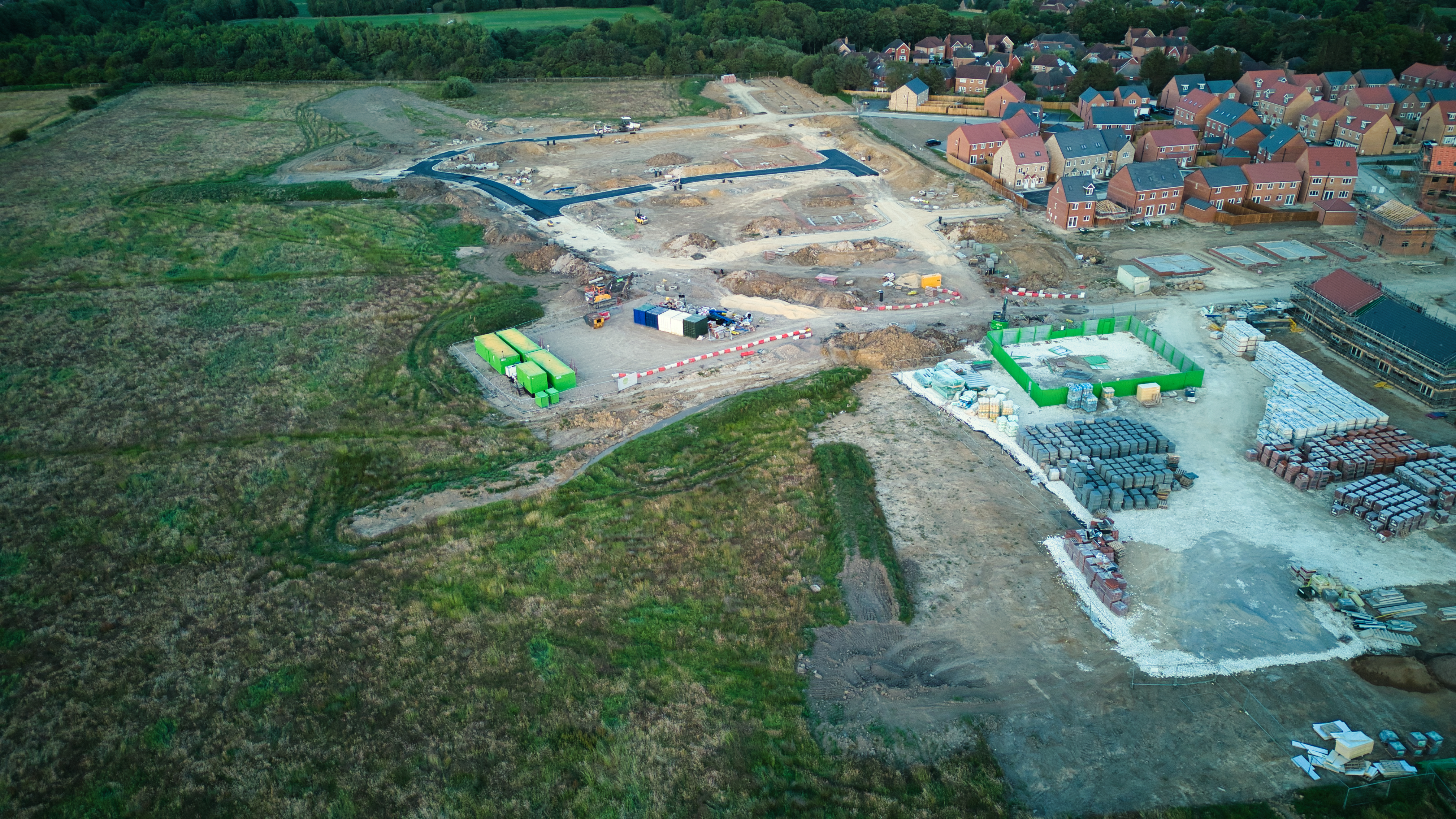 Aerial view of a construction site with materials and machinery near a residential area at dusk.