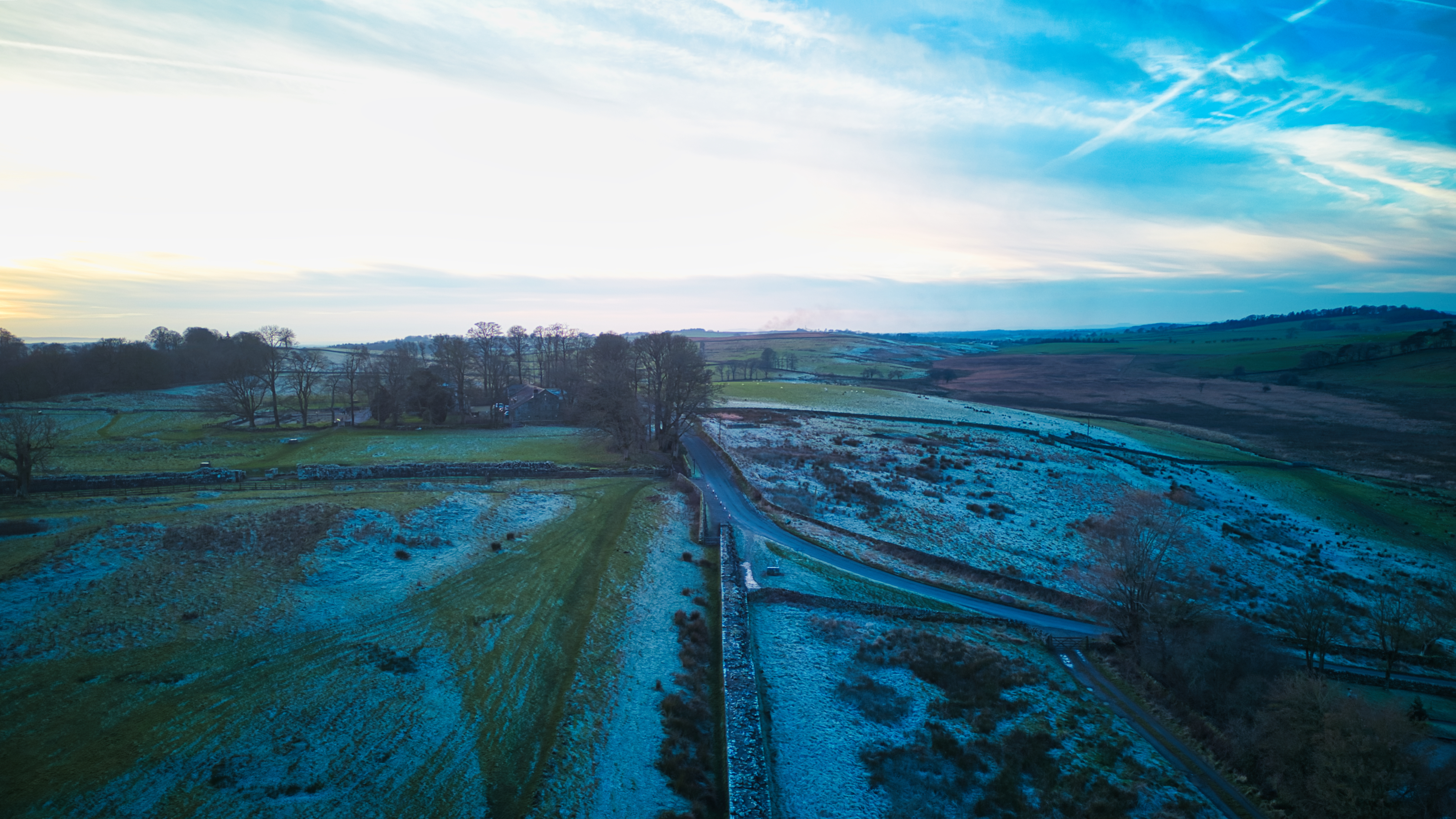 Aerial view of a countryside road at dawn with fields and trees under a soft blue sky with wispy clouds.