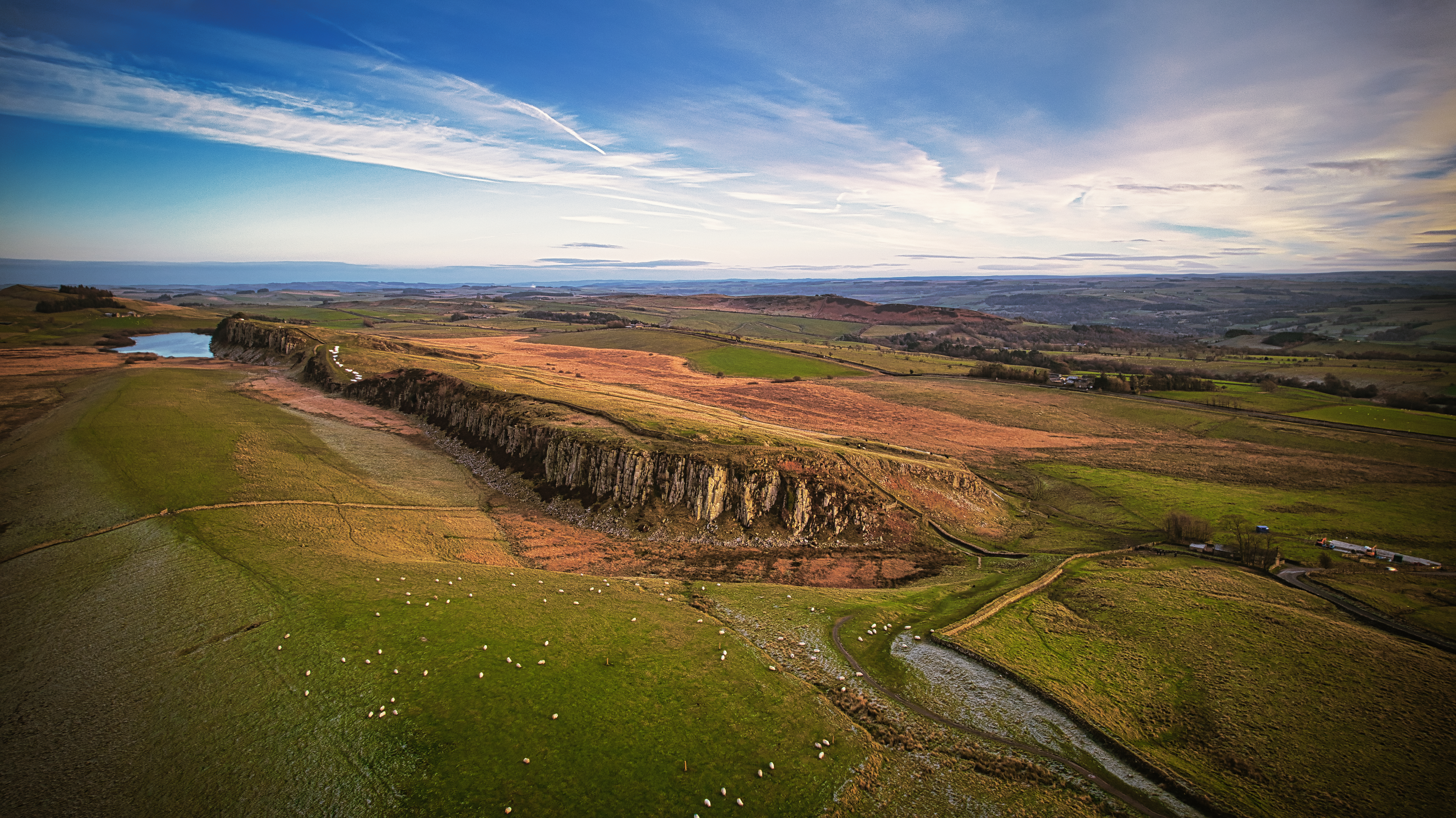 Aerial view of a countryside road at sunset with lush green fields and a soft, colorful sky at Sycamore Gap, Northumberland, UK.