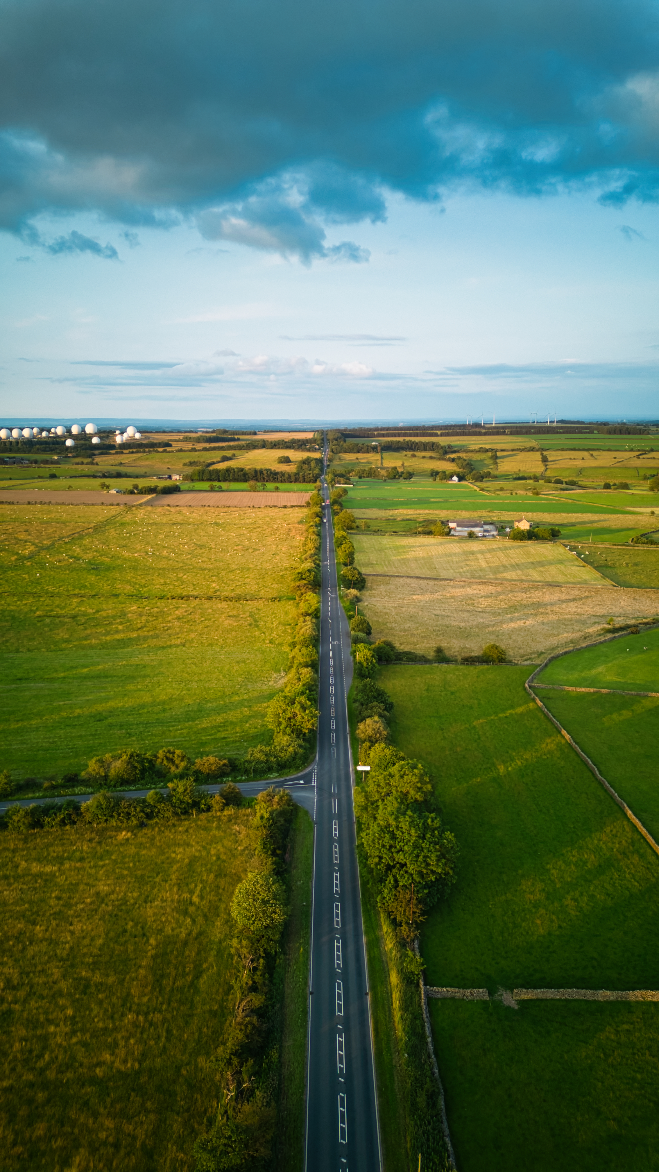 Aerial view of a countryside road cutting through green fields with a coastal line in the distance under a cloudy sky in Yorkshire.