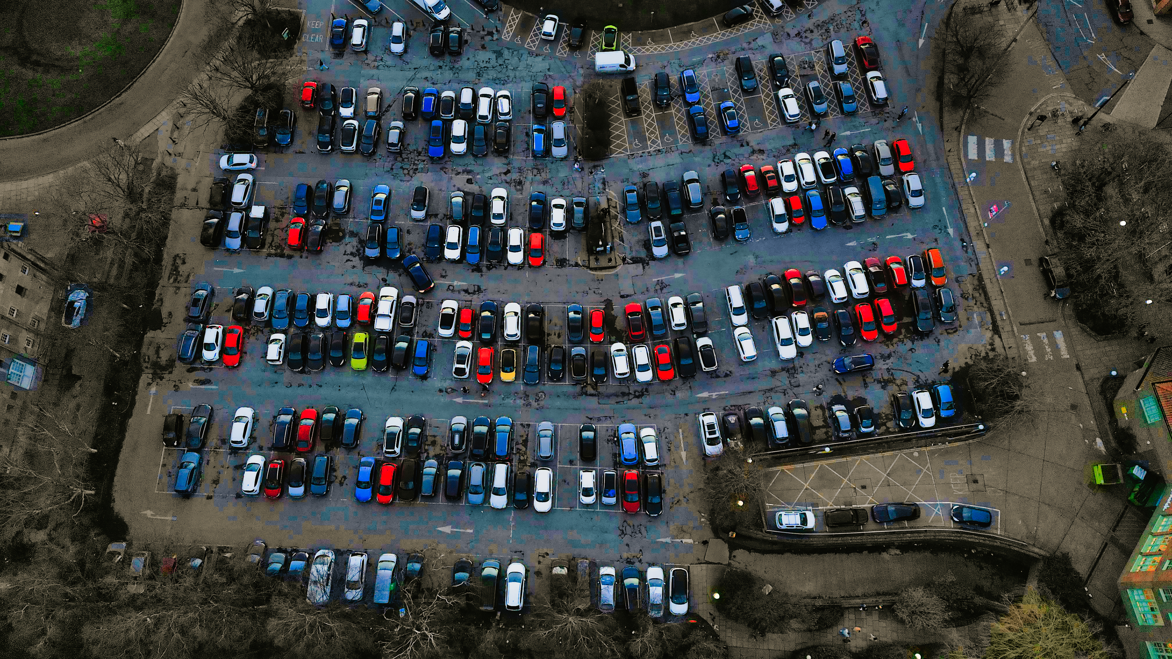 Aerial view of a crowded parking lot with various cars neatly parked in rows, showcasing urban transportation and infrastructure in York, North Yorkshire