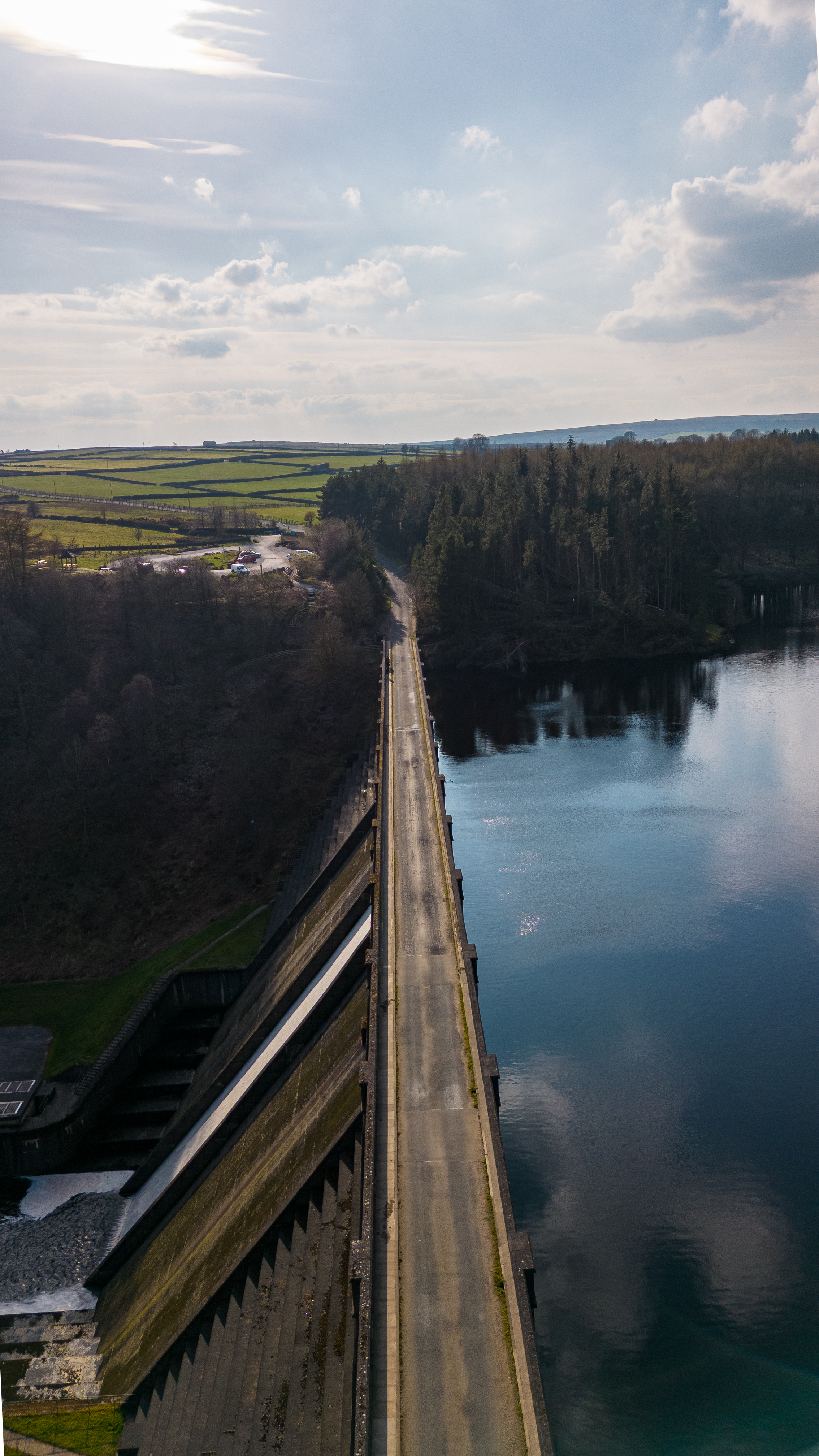 Aerial view of a dam with a road on top, dividing a forest and a calm blue reservoir under a cloudy sky.