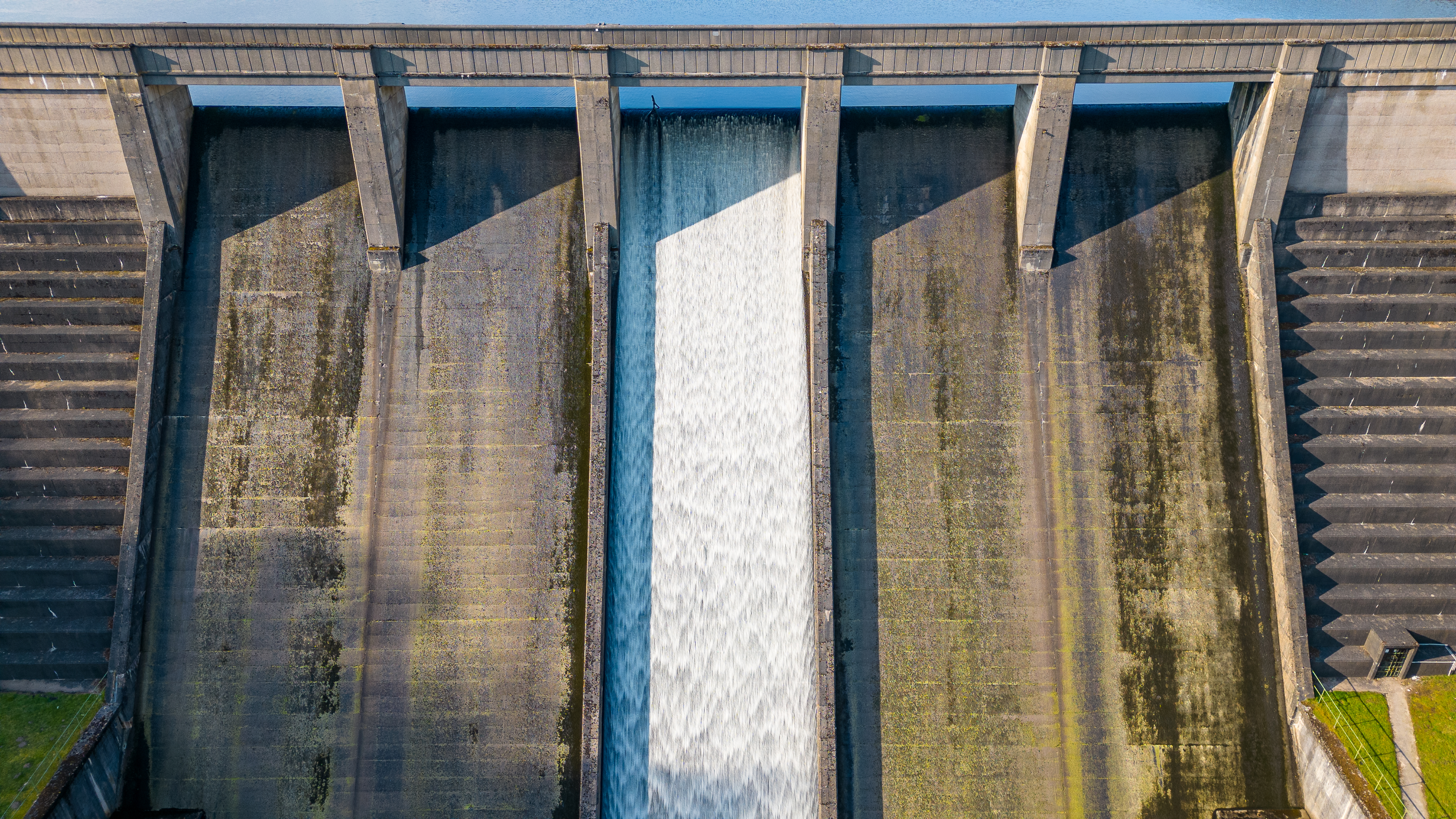 Aerial view of a dam with water cascading down its spillway, showcasing industrial architecture and renewable energy concept.