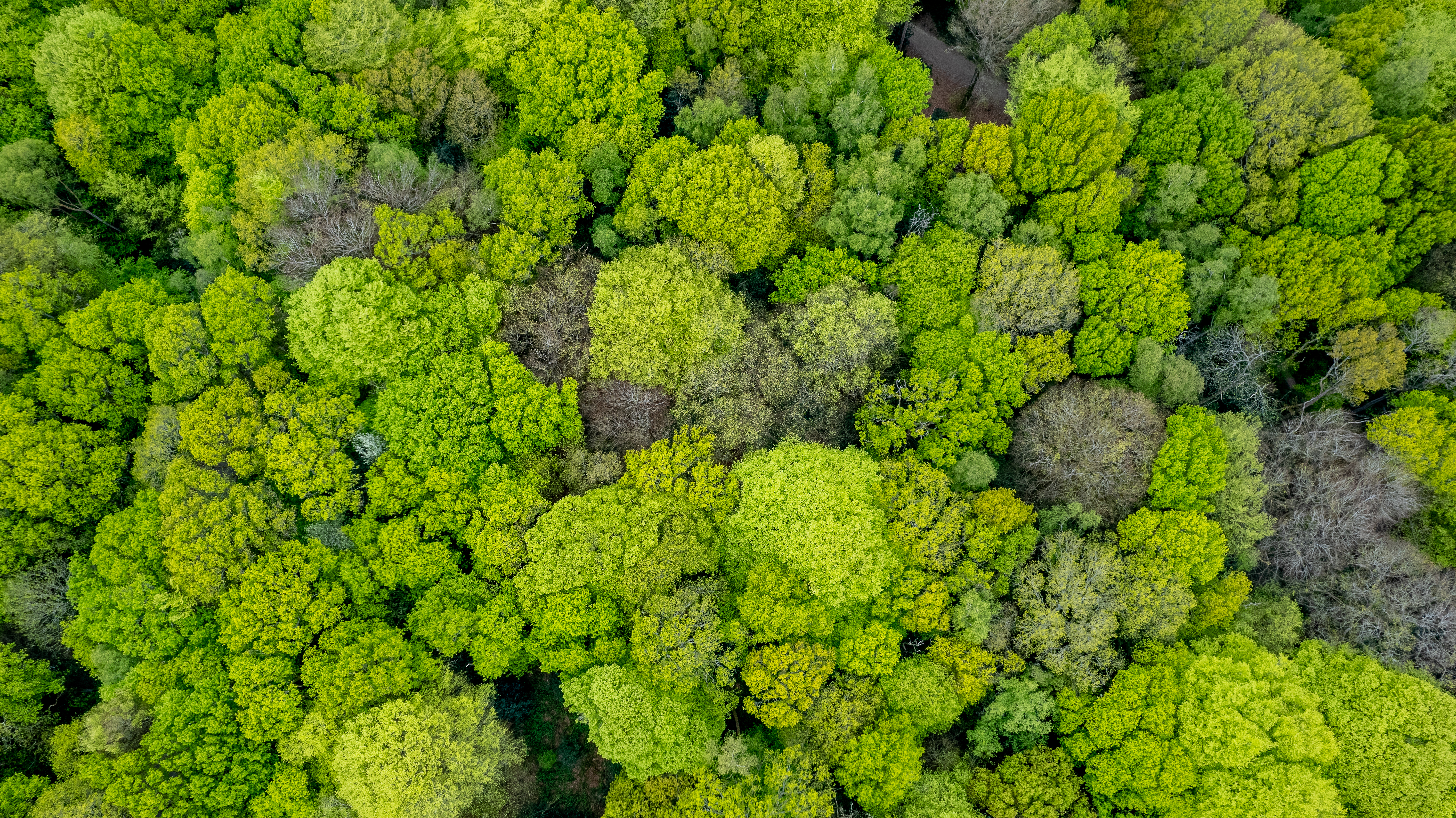 Aerial view of a dense, green forest canopy, showcasing the natural patterns and textures of treetops.