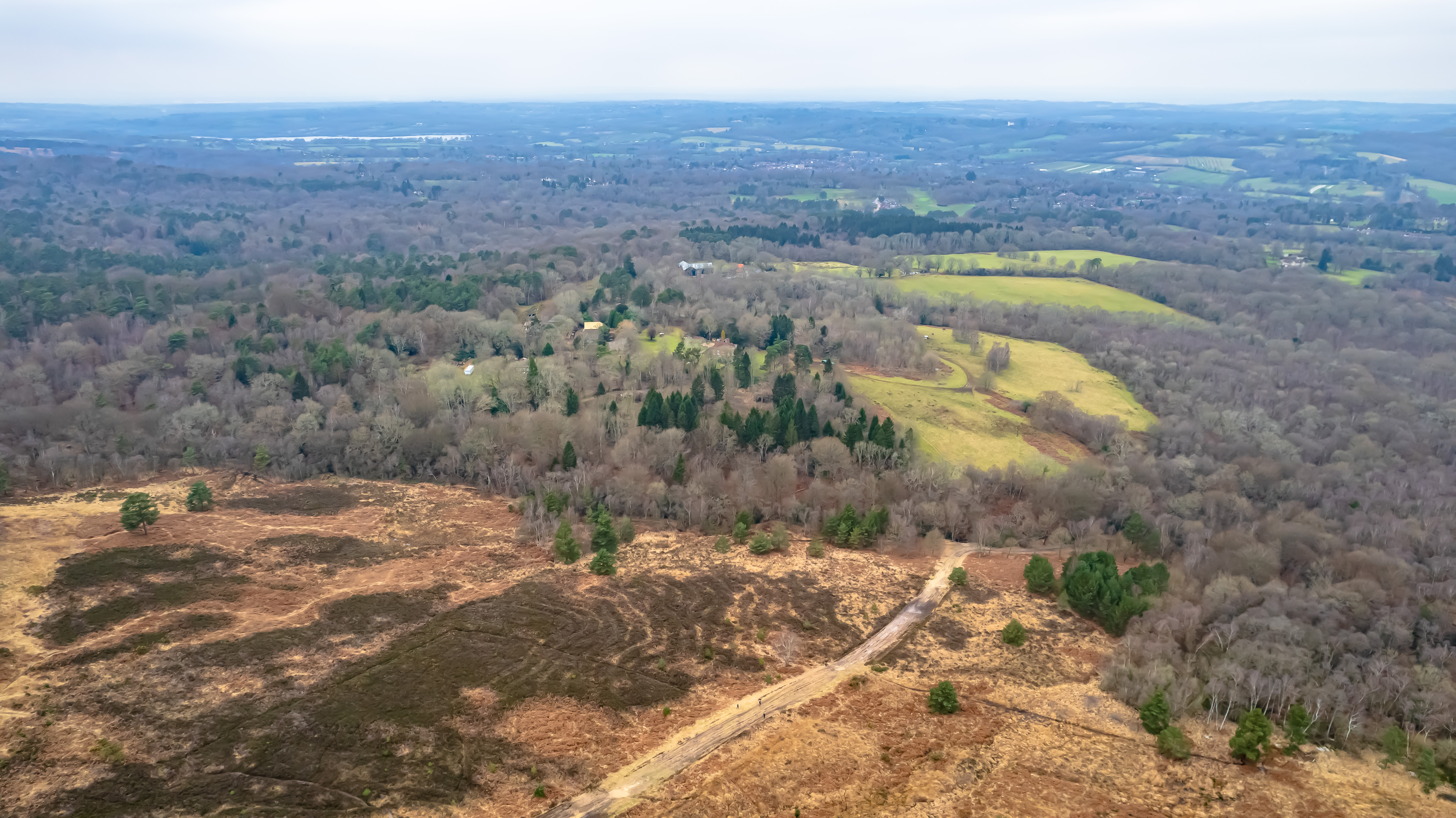 Aerial view of a diverse landscape with forest and open fields under a cloudy sky.