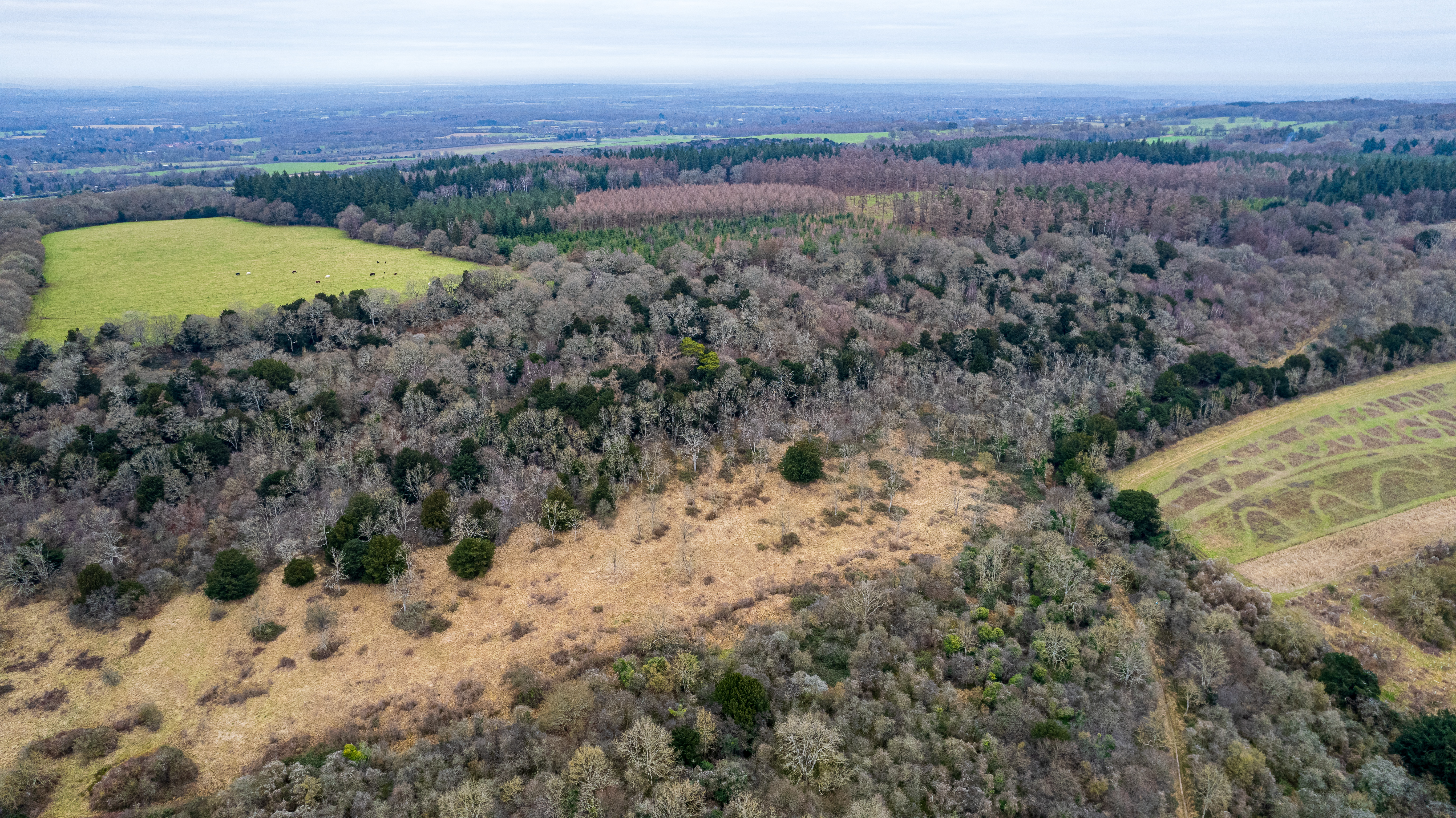 Aerial view of a diverse landscape with patches of forest and open fields, showcasing the contrast between wooded areas and agriculture.