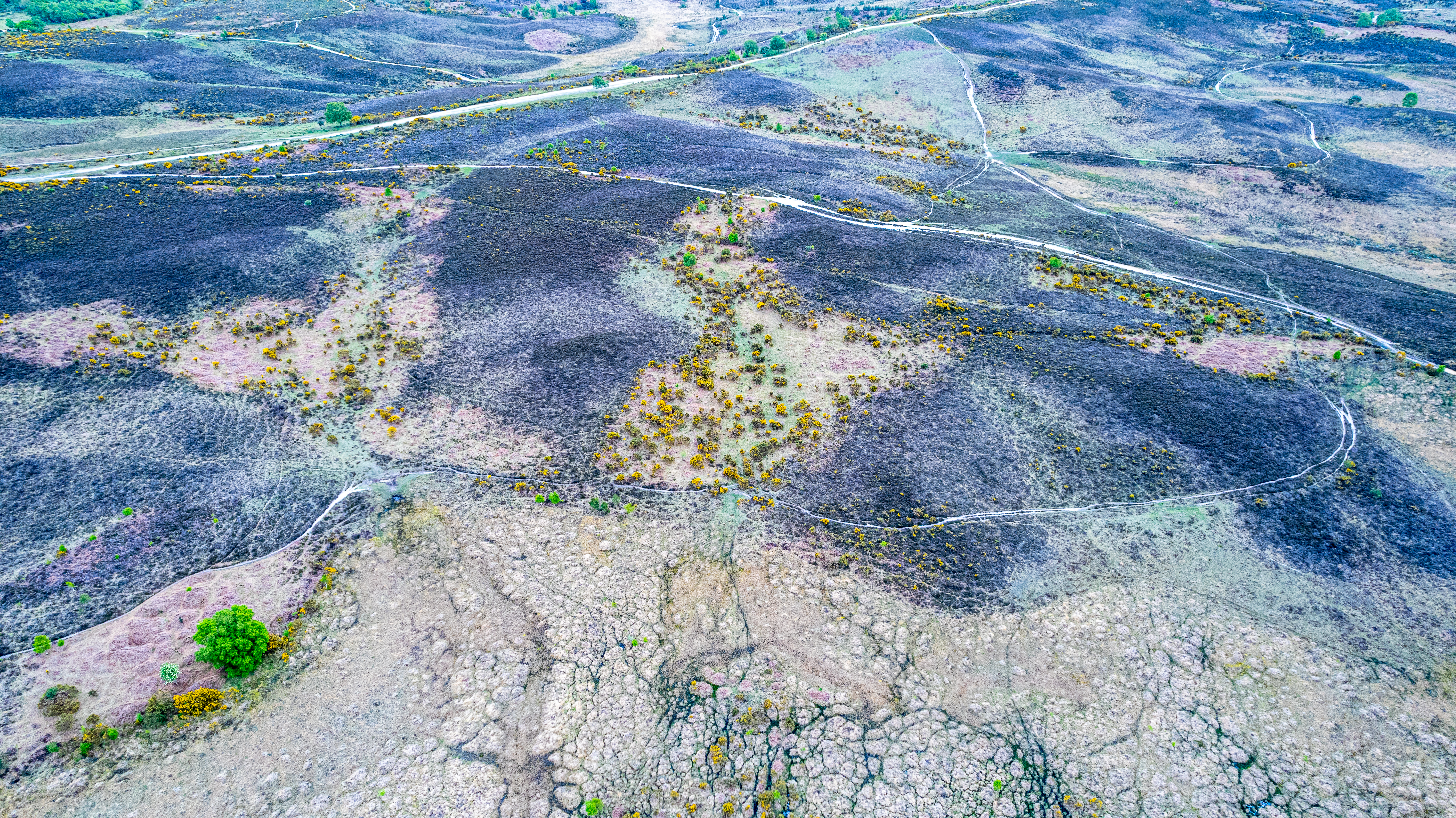 Aerial view of a dry, cracked landscape with sparse greenery, depicting drought conditions.