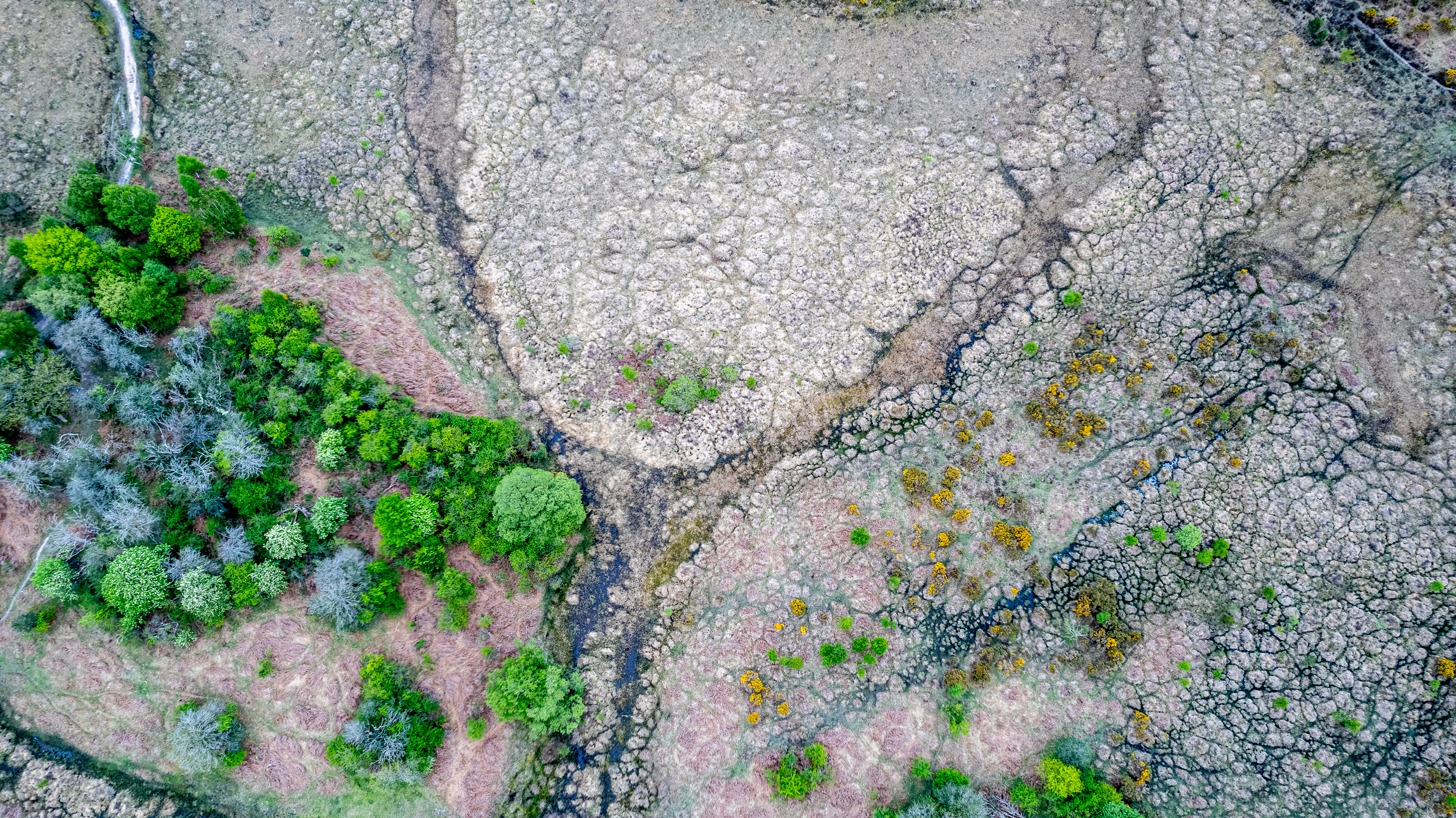 Aerial view of a dry landscape with green shrubbery and meandering trails.