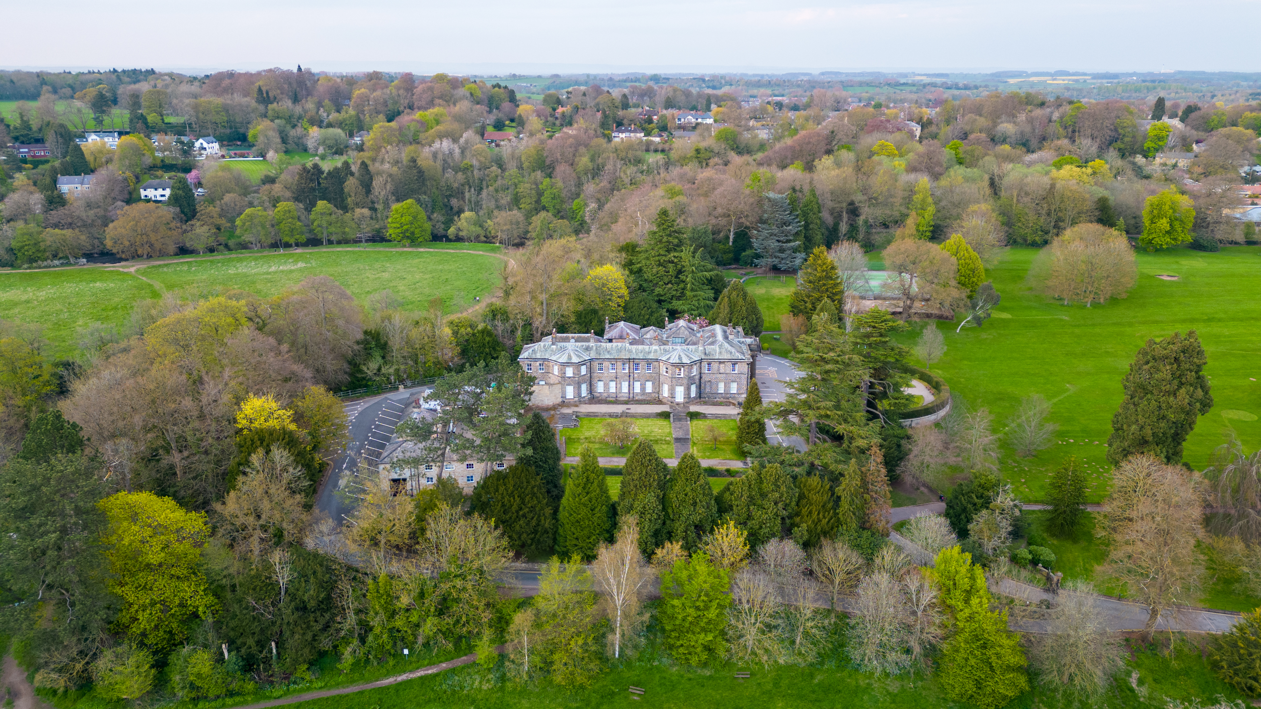 Aerial view of a grand estate amidst lush greenery in a rural landscape in Knaresborough, North Yorkshire.