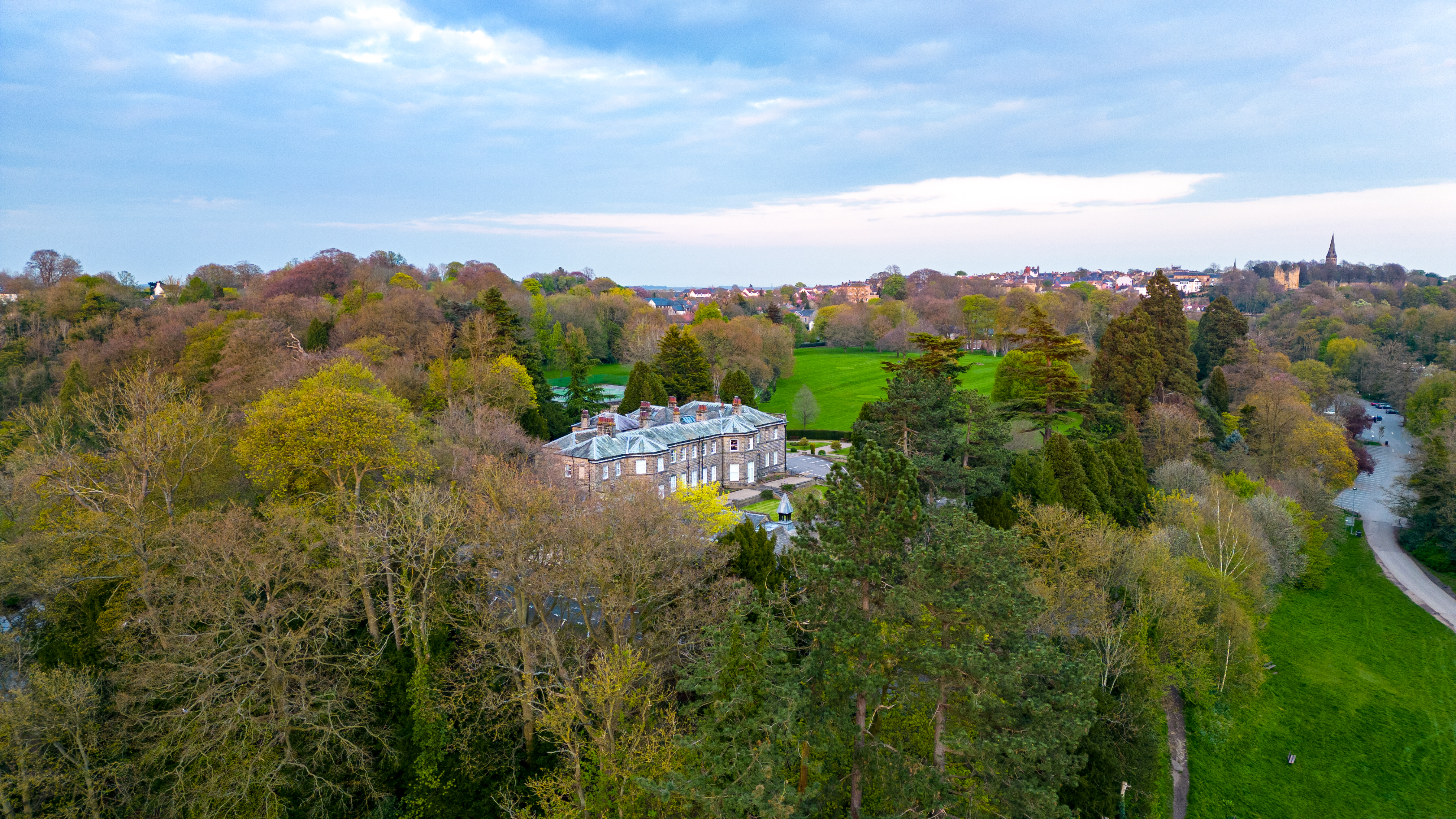 Aerial view of a grand house nestled in lush greenery with a scenic backdrop of a vibrant sky at dusk in Knaresborough, North Yorkshire.