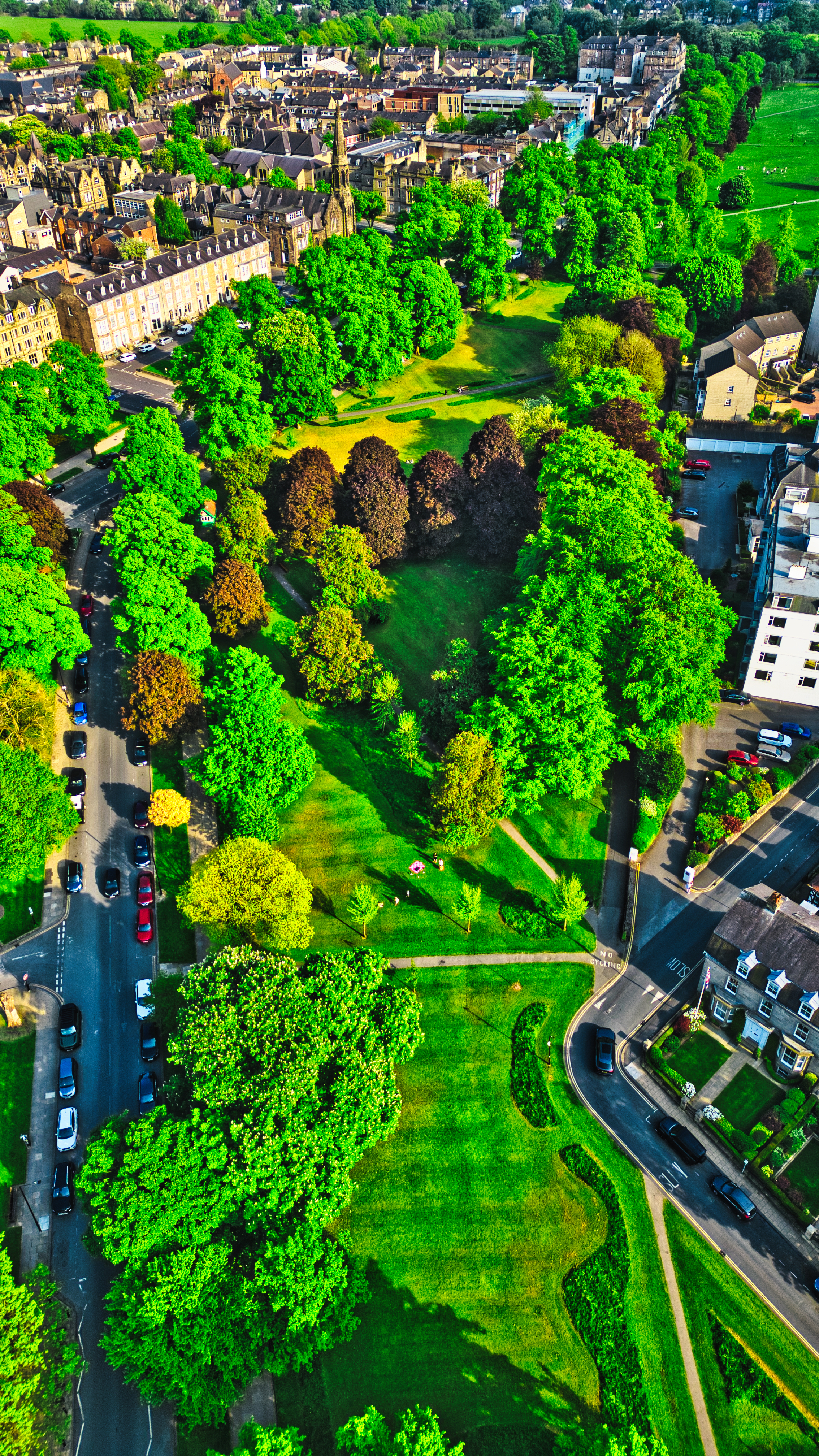 Aerial view of a lush green park surrounded by residential buildings and roads. The park features various trees and open grassy areas, with a few people visible enjoying the space. The surrounding buildings are a mix of historical and modern architecture.