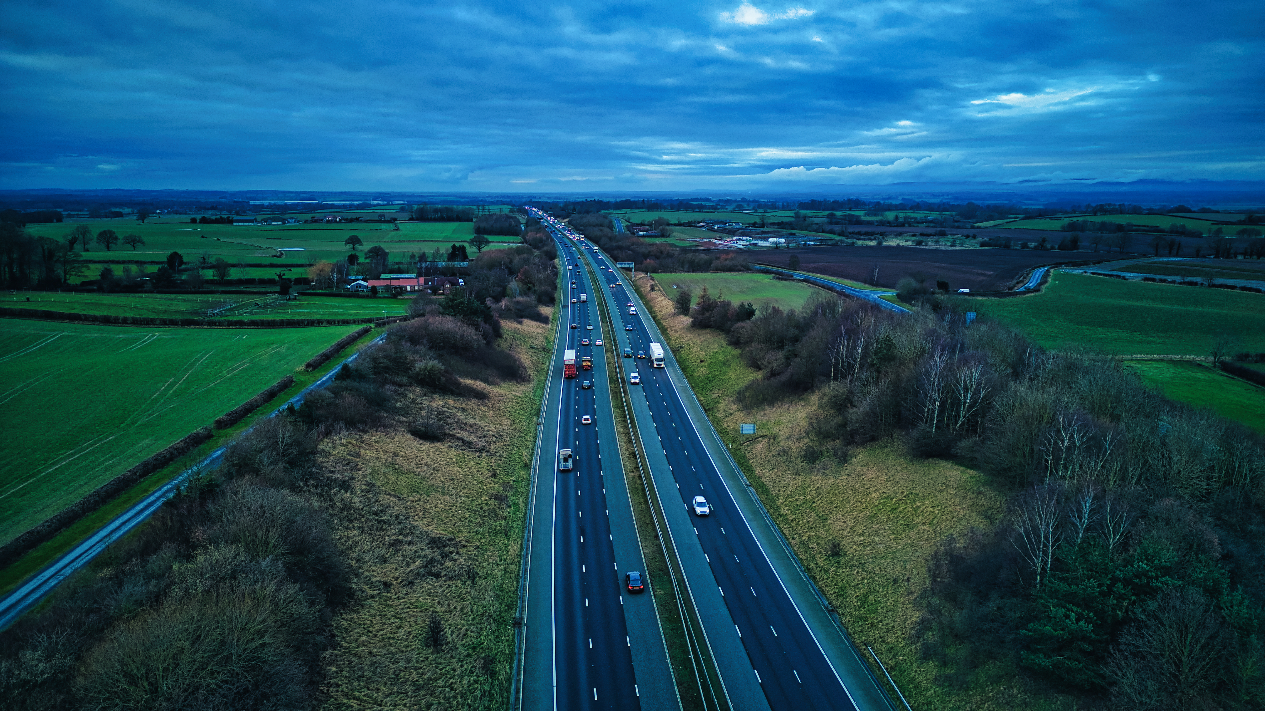 Aerial view of a highway cutting through a lush countryside under a twilight sky.