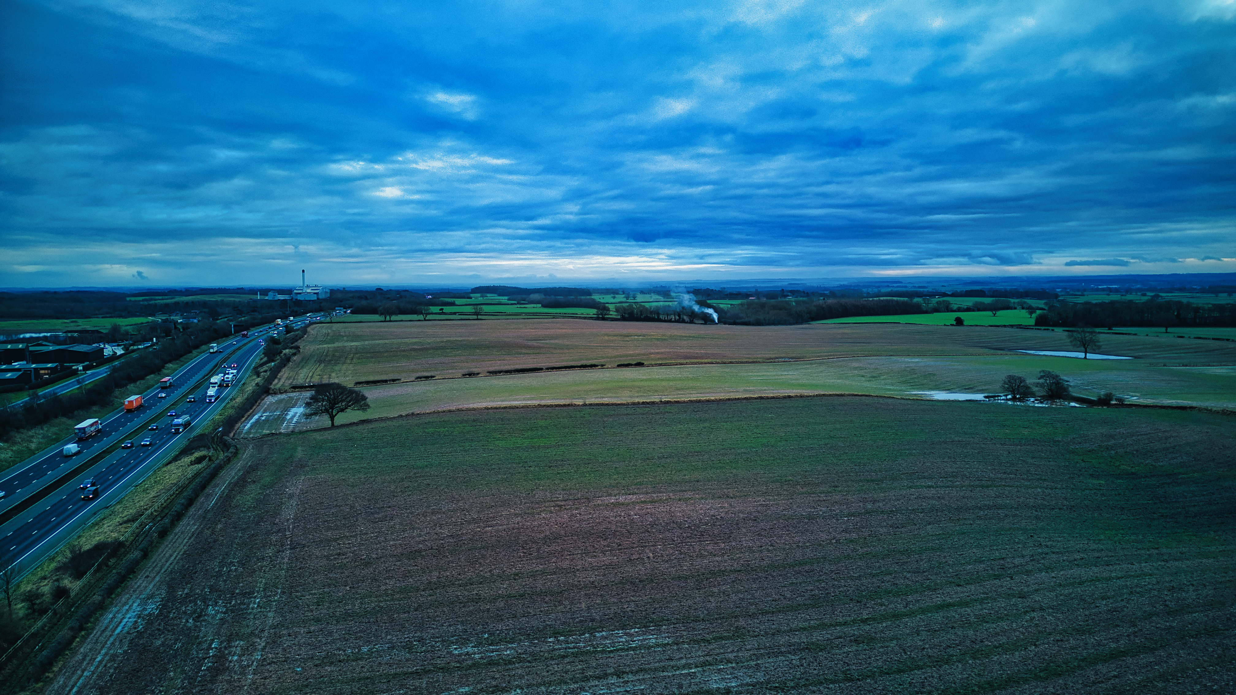 Aerial view of a highway with traffic near farmland under a cloudy sky at dusk.