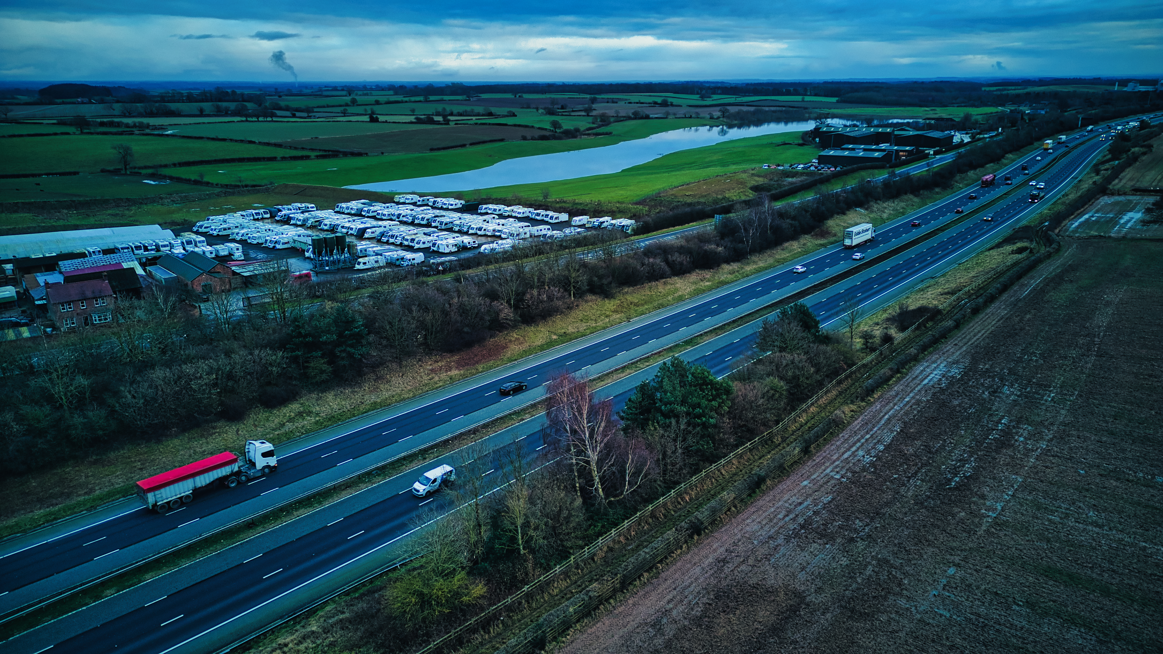 Aerial view of a highway with vehicles at dusk, showcasing transportation and infrastructure with a rural backdrop.