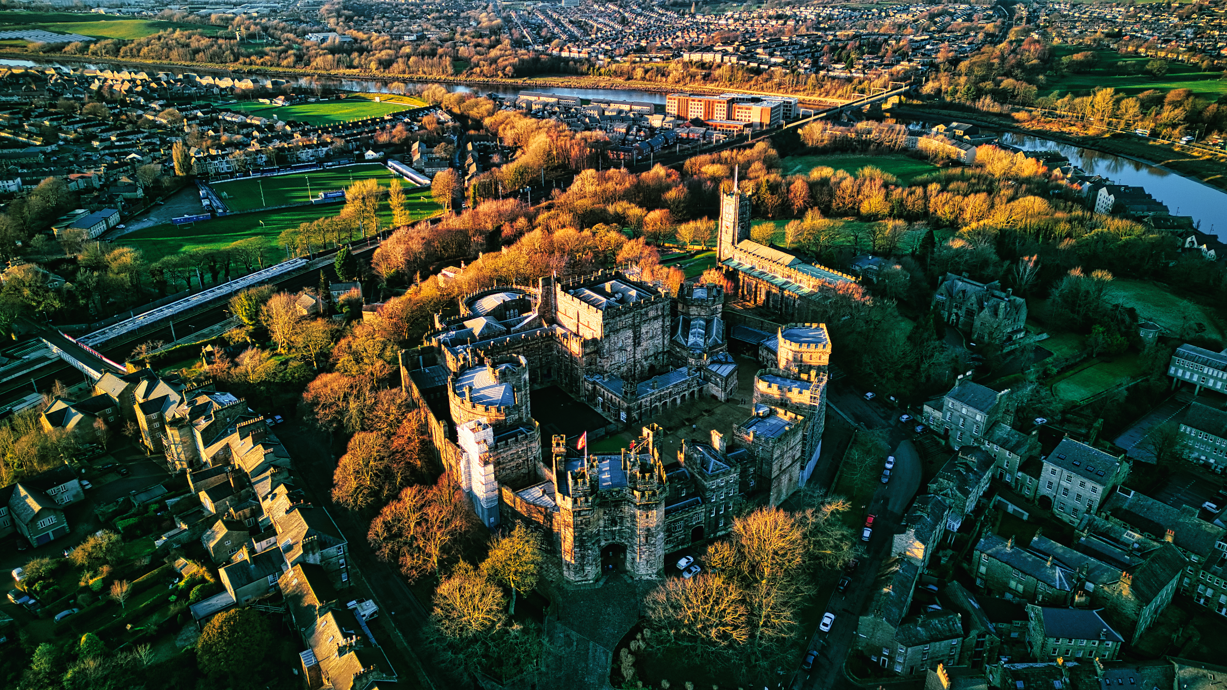 Aerial view of a historic Lancaster castle amidst a lush green landscape with surrounding urban area during golden hour.