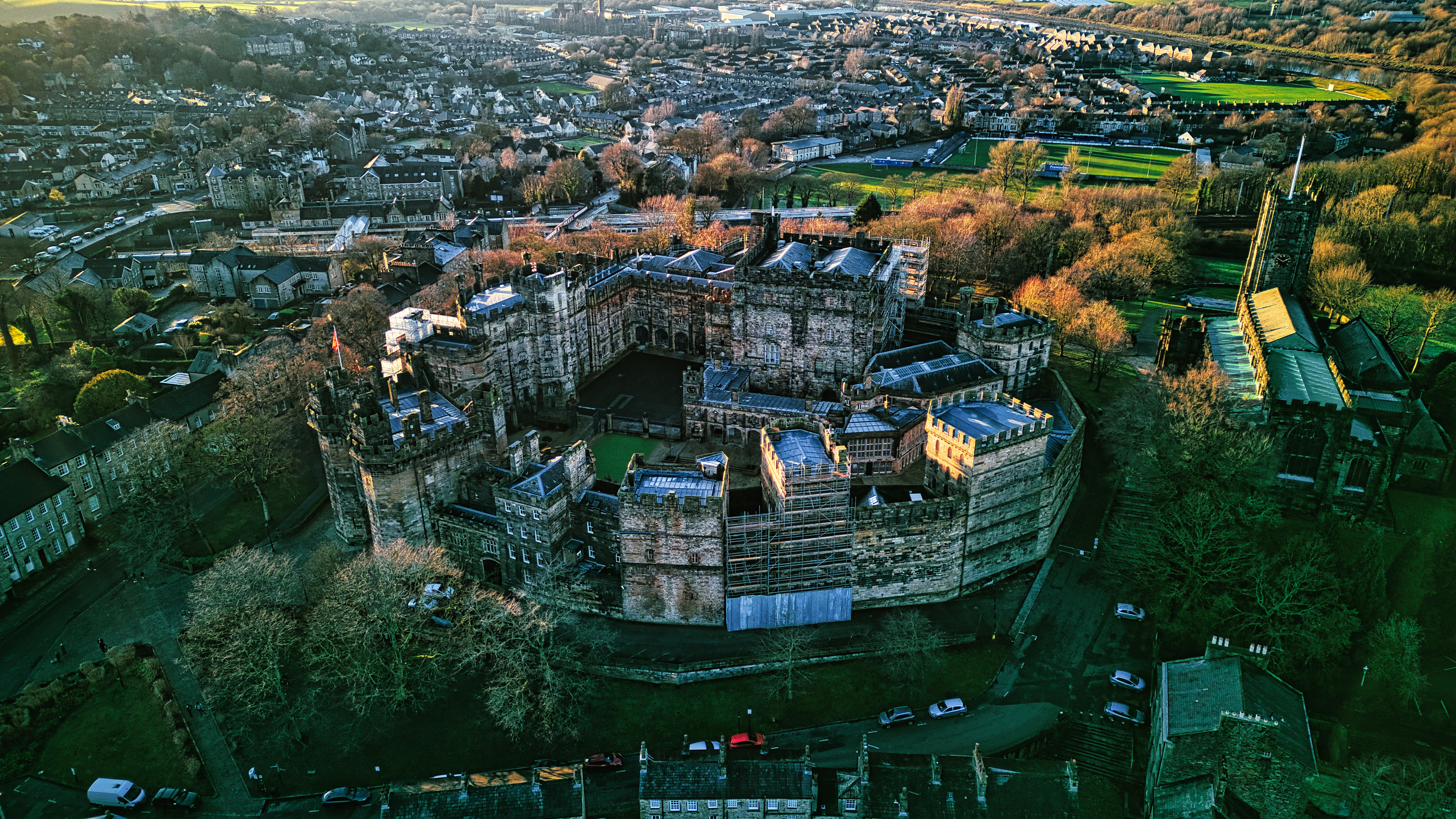 Aerial view of a historic Lancaster castle amidst a lush urban landscape at sunset.