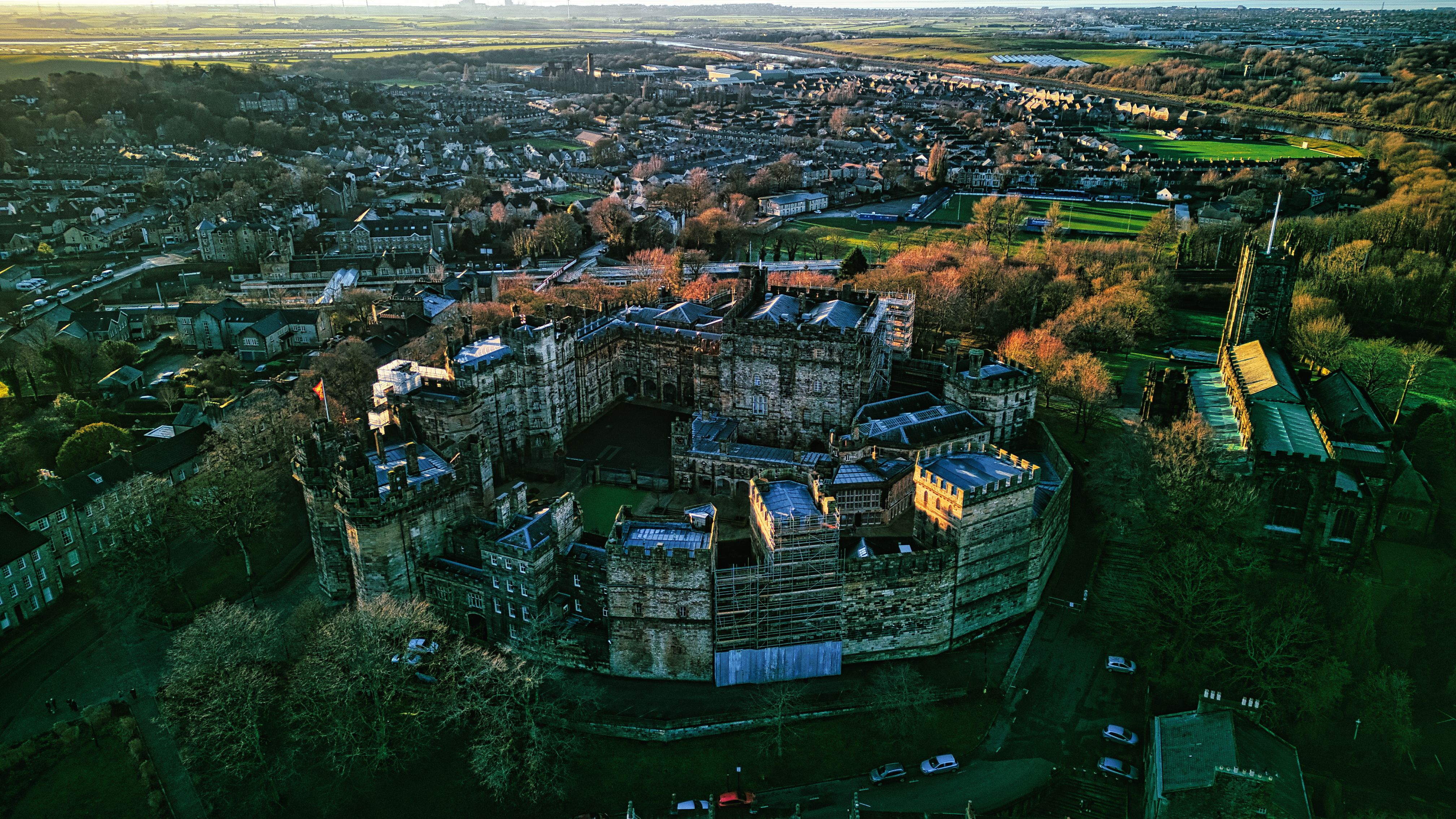 Aerial view of a historic Lancaster castle at sunset with surrounding cityscape and greenery.