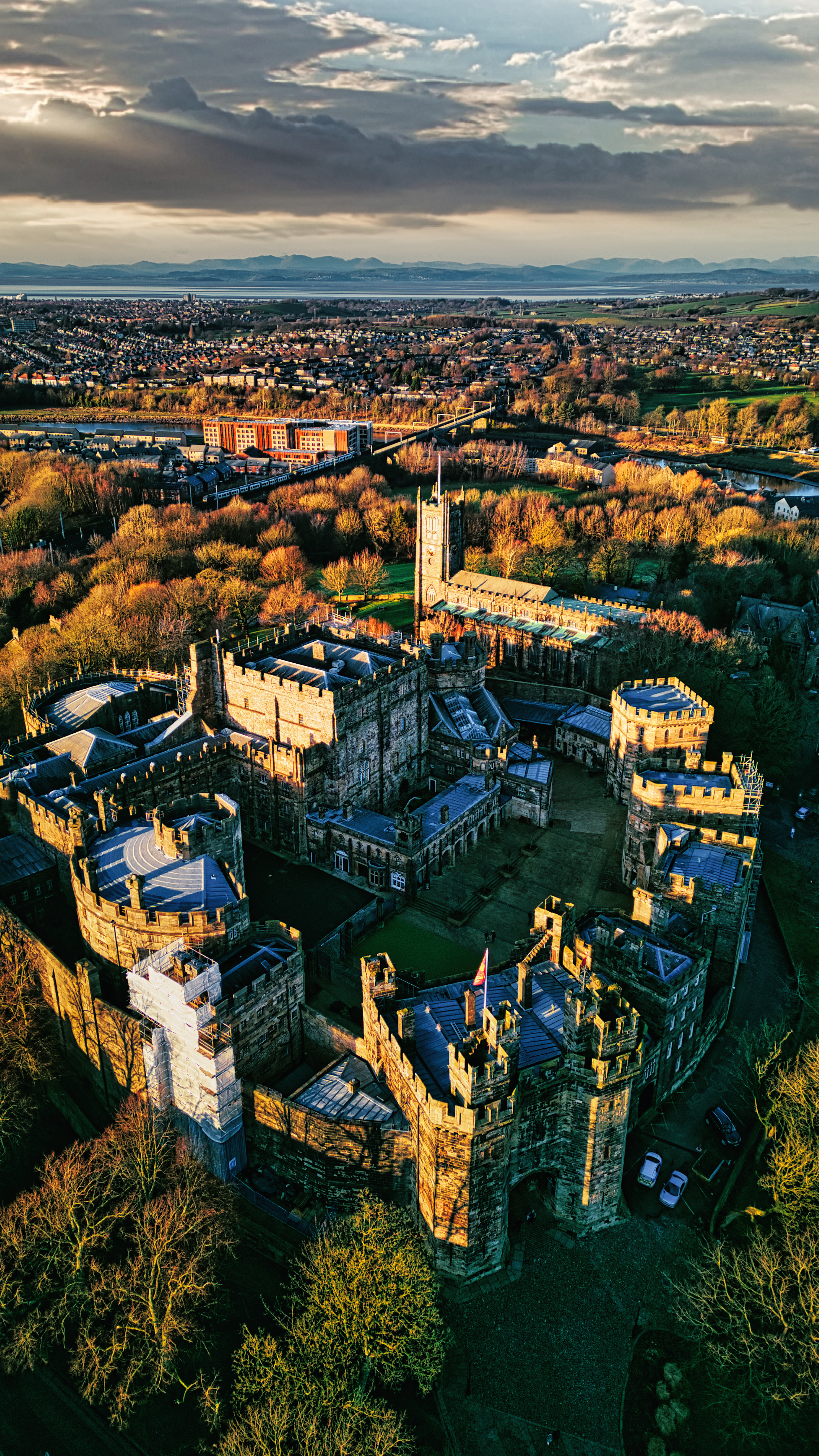 Aerial view of a historic Lancaster castle at sunset with surrounding gardens and distant cityscape.