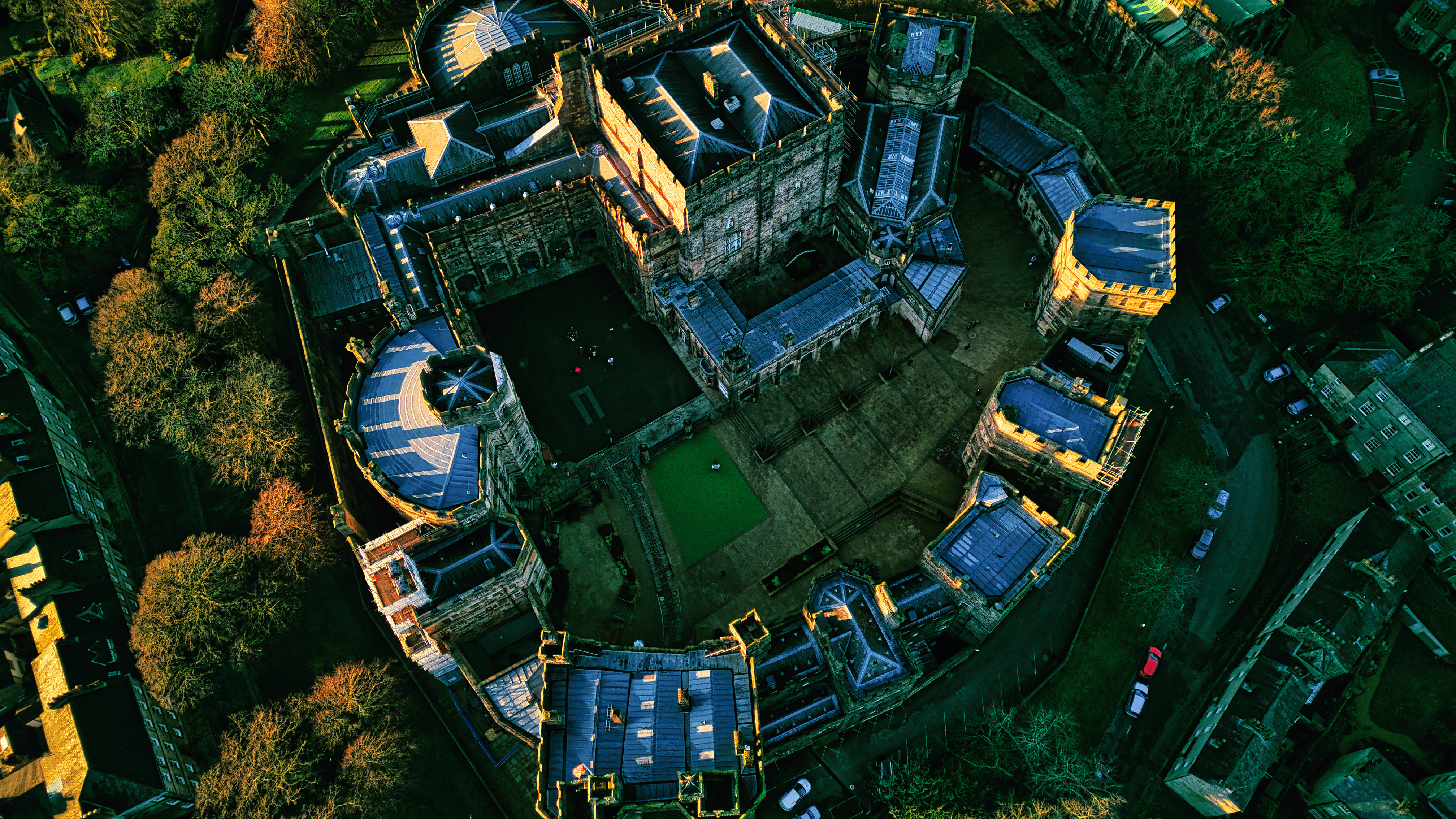 Aerial view of a historic Lancaster castle at sunset with surrounding greenery.