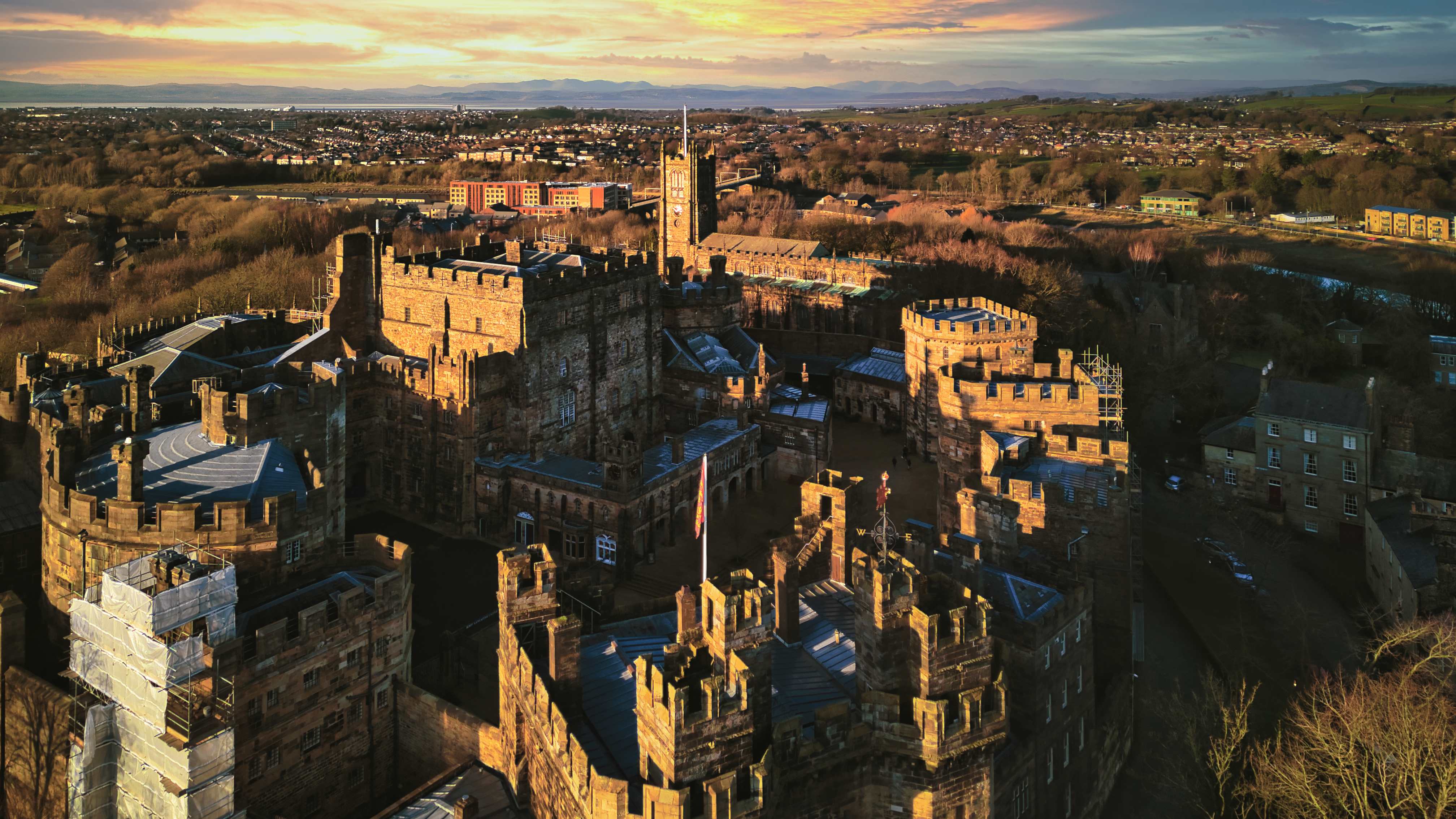 Aerial view of a historic castle at sunset with surrounding landscape and town under a golden sky in Lancaster.