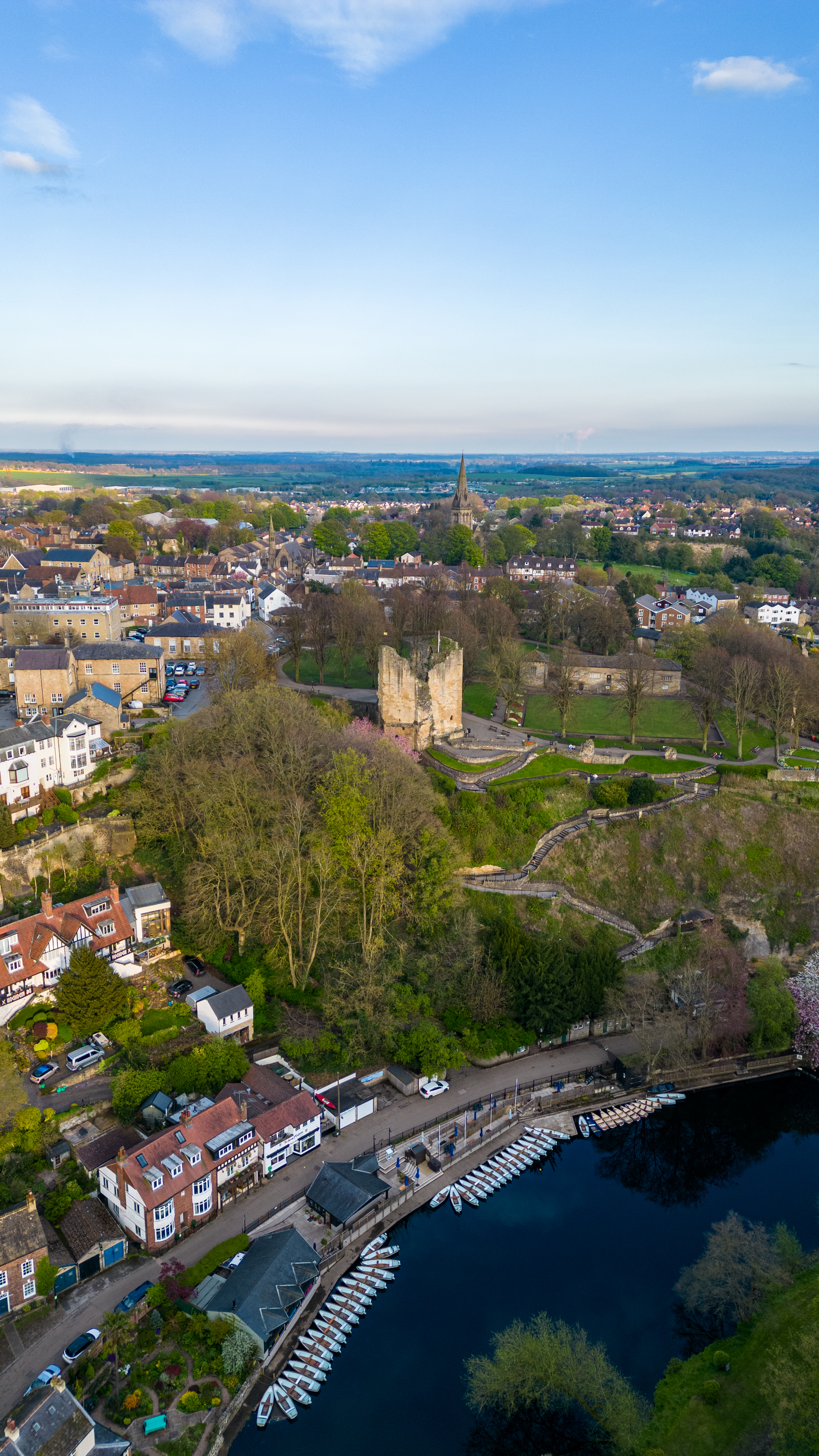 Aerial view of a historic castle by a river with surrounding greenery and residential area under a blue sky in Knaresborough, North Yorkshire.