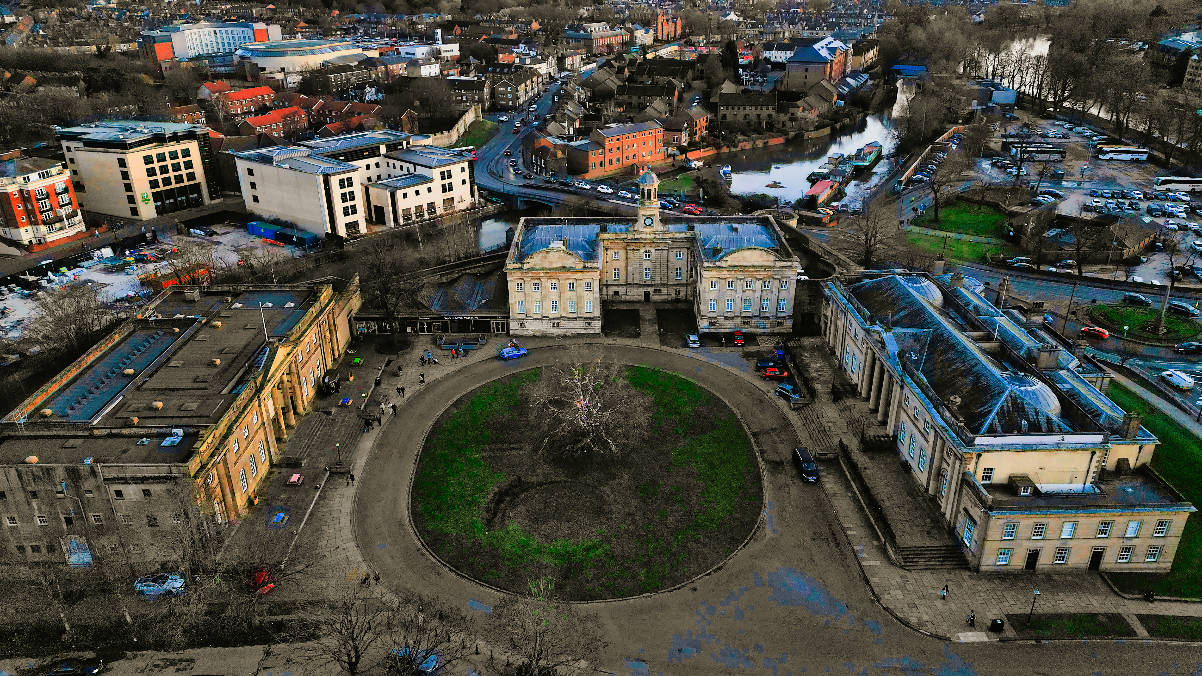 Aerial view of a historic circular stone fortress at dusk, with surrounding urban landscape and sunset sky in York, North Yorkshire
