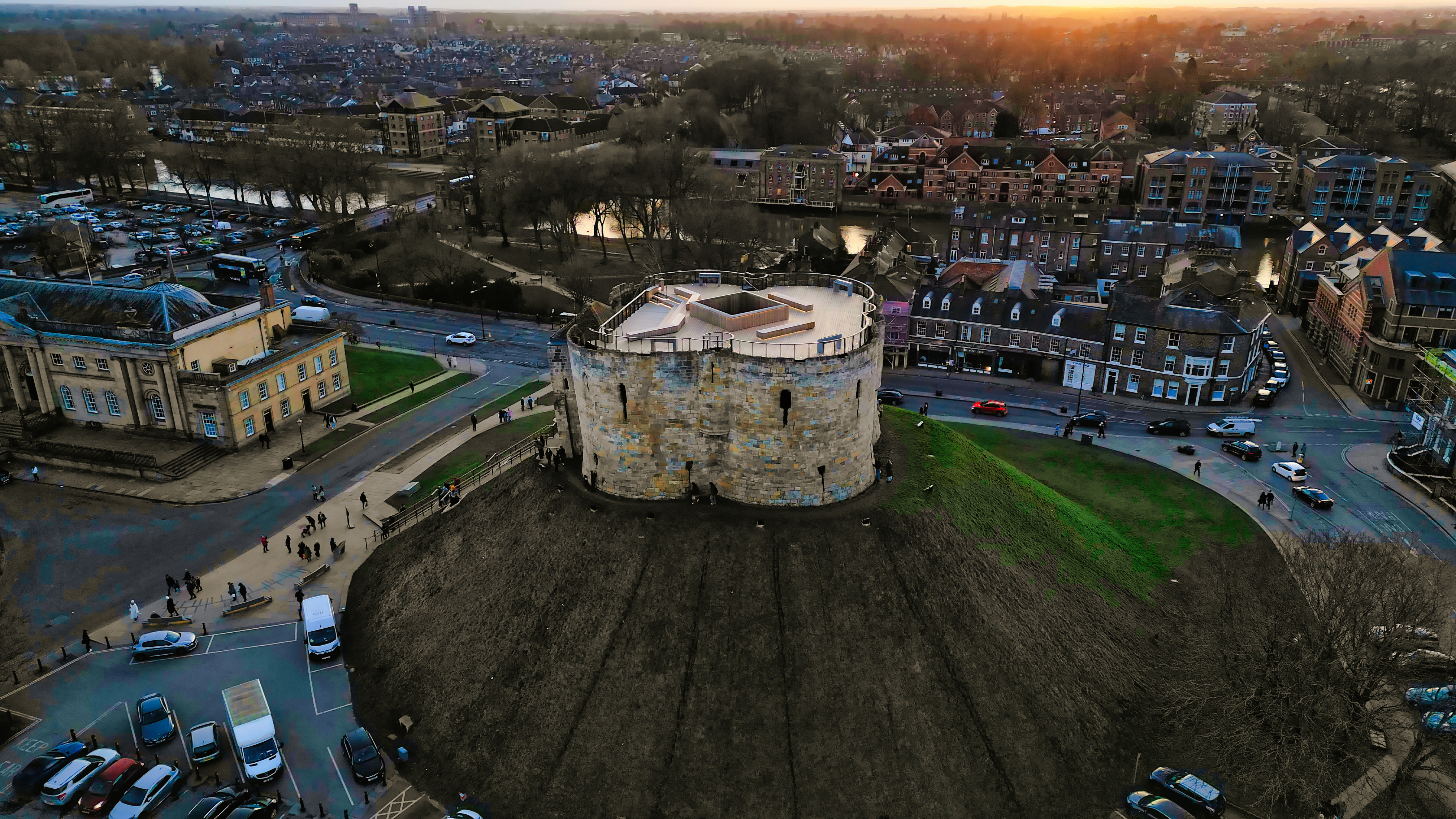 Aerial view of a historic circular stone fortress at dusk, with surrounding urban landscape and sunset sky in York, North Yorkshire
