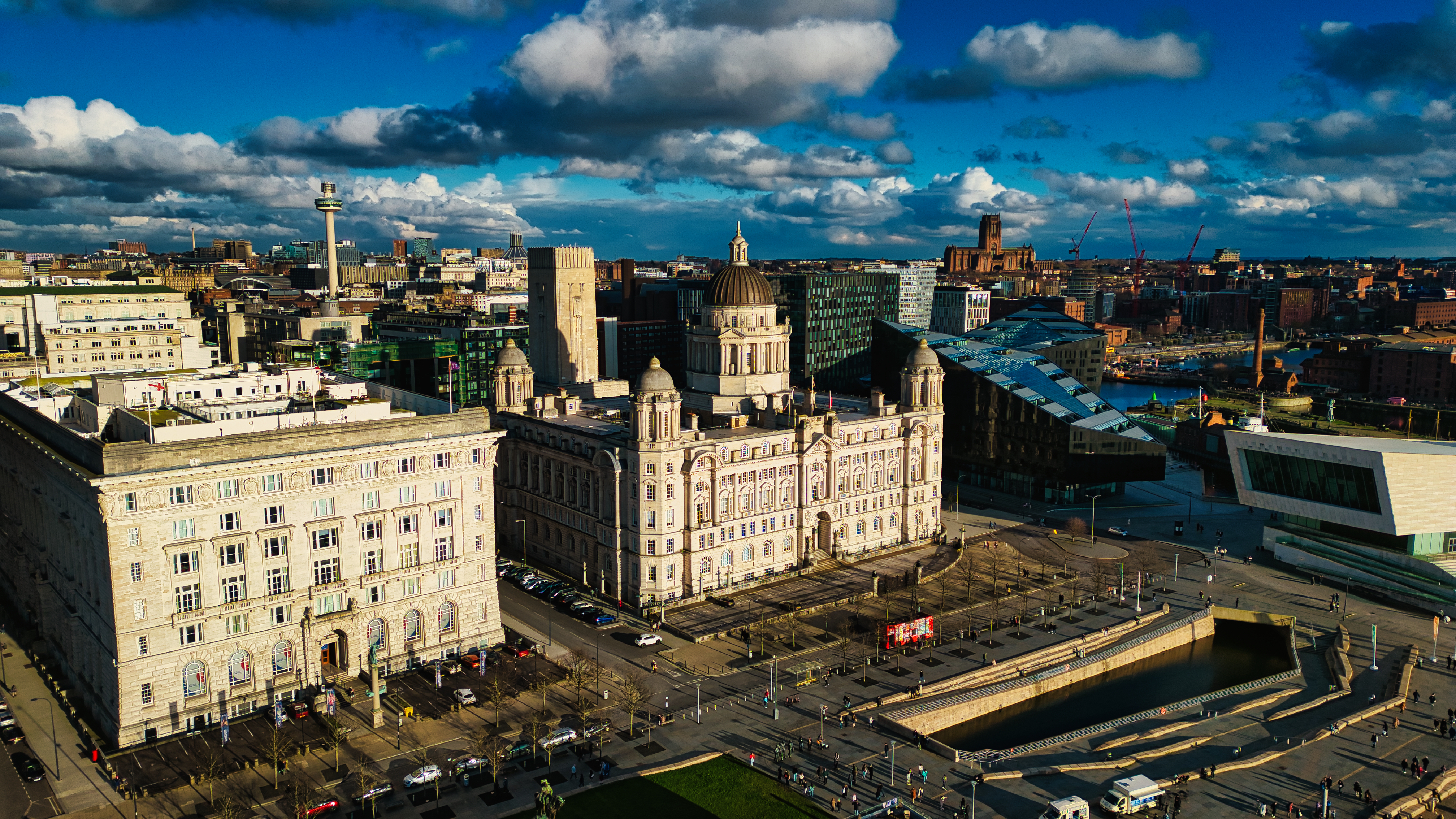 Aerial view of a historic cityscape with dramatic clouds and sunlight, showcasing iconic buildings and a river in Liverpool, UK.