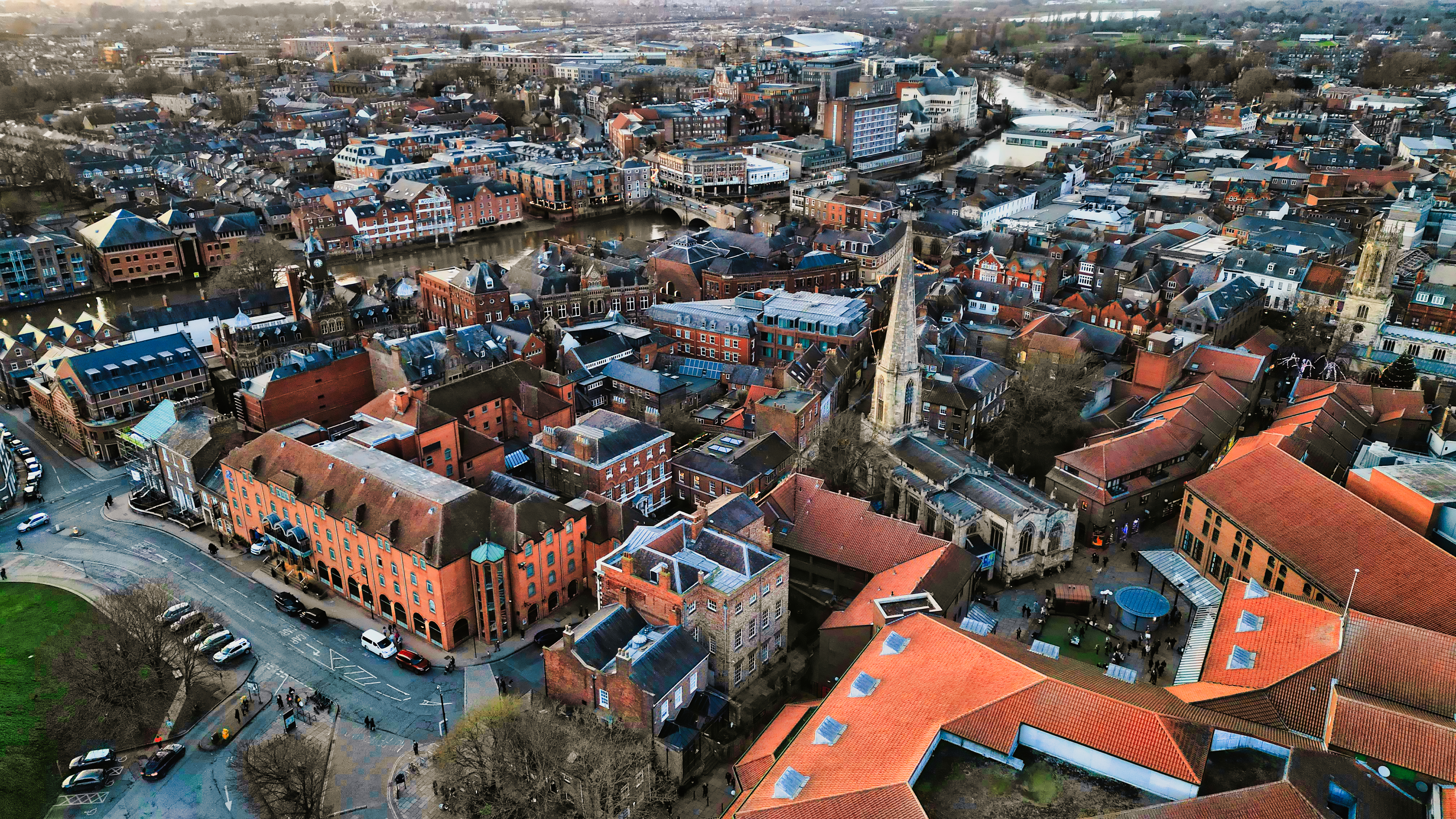 Aerial view of a historic town at dusk with warm lighting, showcasing the urban architecture and streets in York, North Yorkshire