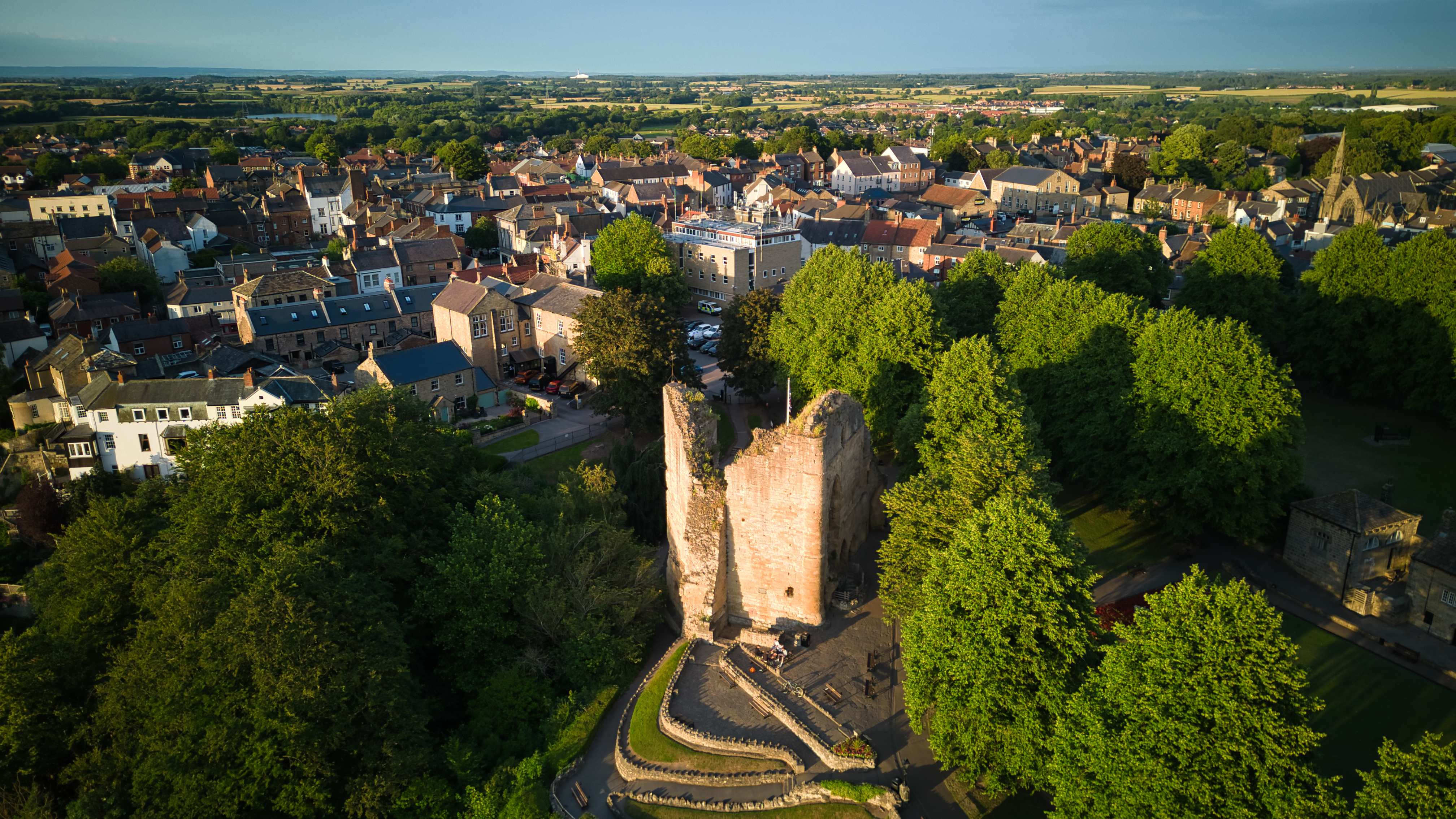 Aerial view of a historic town with an ancient tower, surrounded by lush green trees under a clear blue sky in Knaresborough, North Yorkshire.
