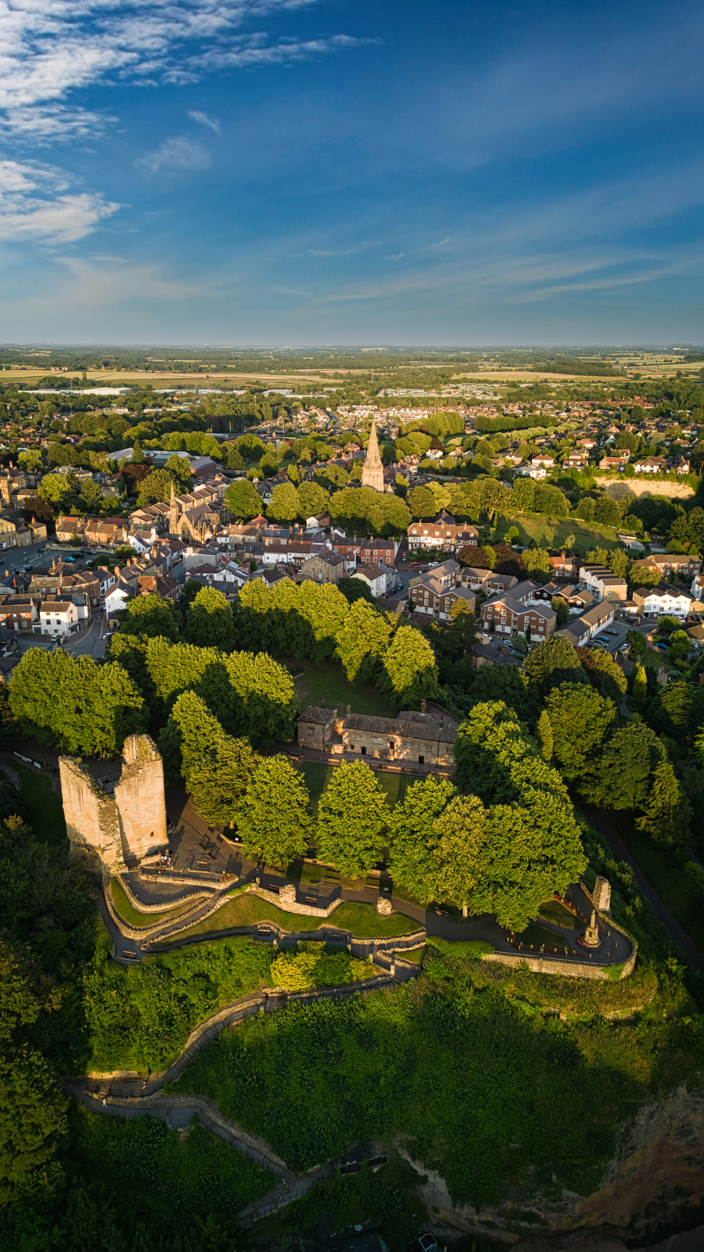 Aerial view of a historic town with lush greenery and ancient walls under a clear blue sky in Knaresborough, North Yorkshire.