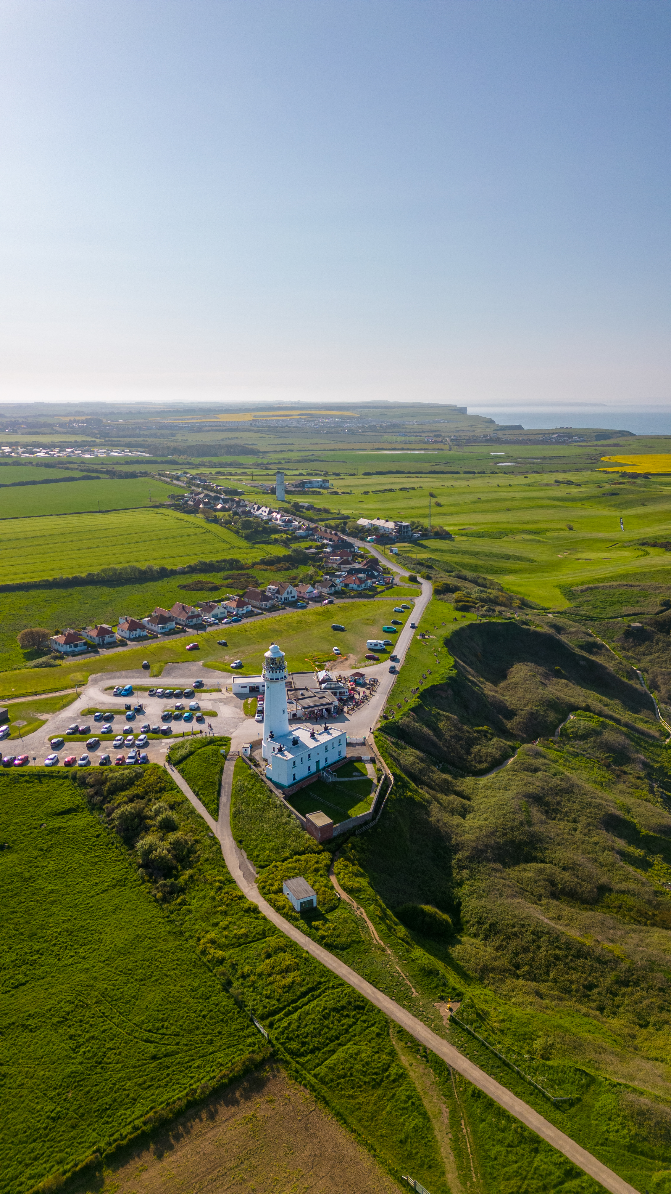 Aerial view of a lighthouse with adjacent buildings surrounded by green fields under a clear blue sky in Flamborough, England