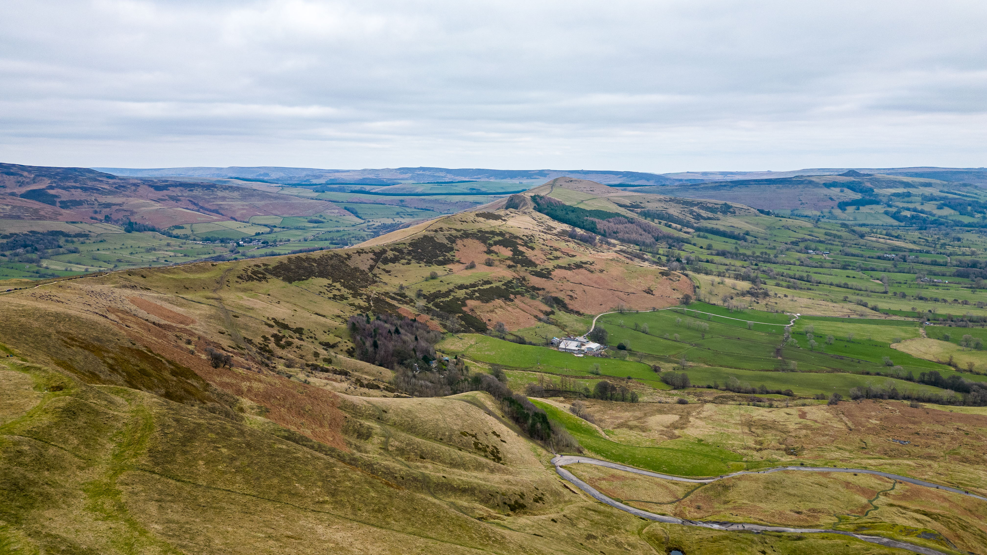Aerial view of a lush, rolling countryside with hills, a winding road, and a solitary house amidst vast greenery in Peak District, England.