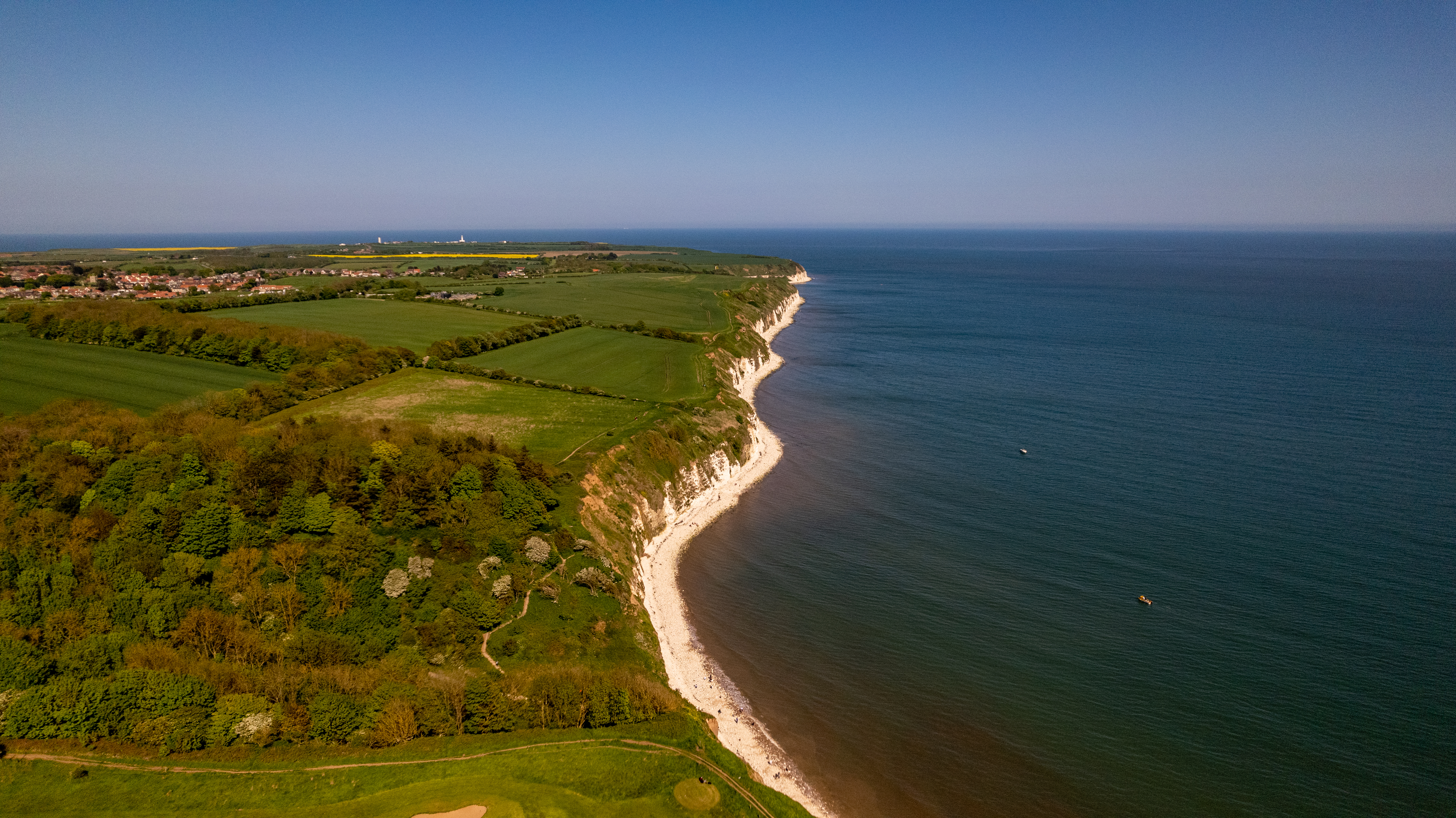 Aerial view of a lush coastline with green fields adjacent to a cliff and beach leading into the sea in Flamborough, England