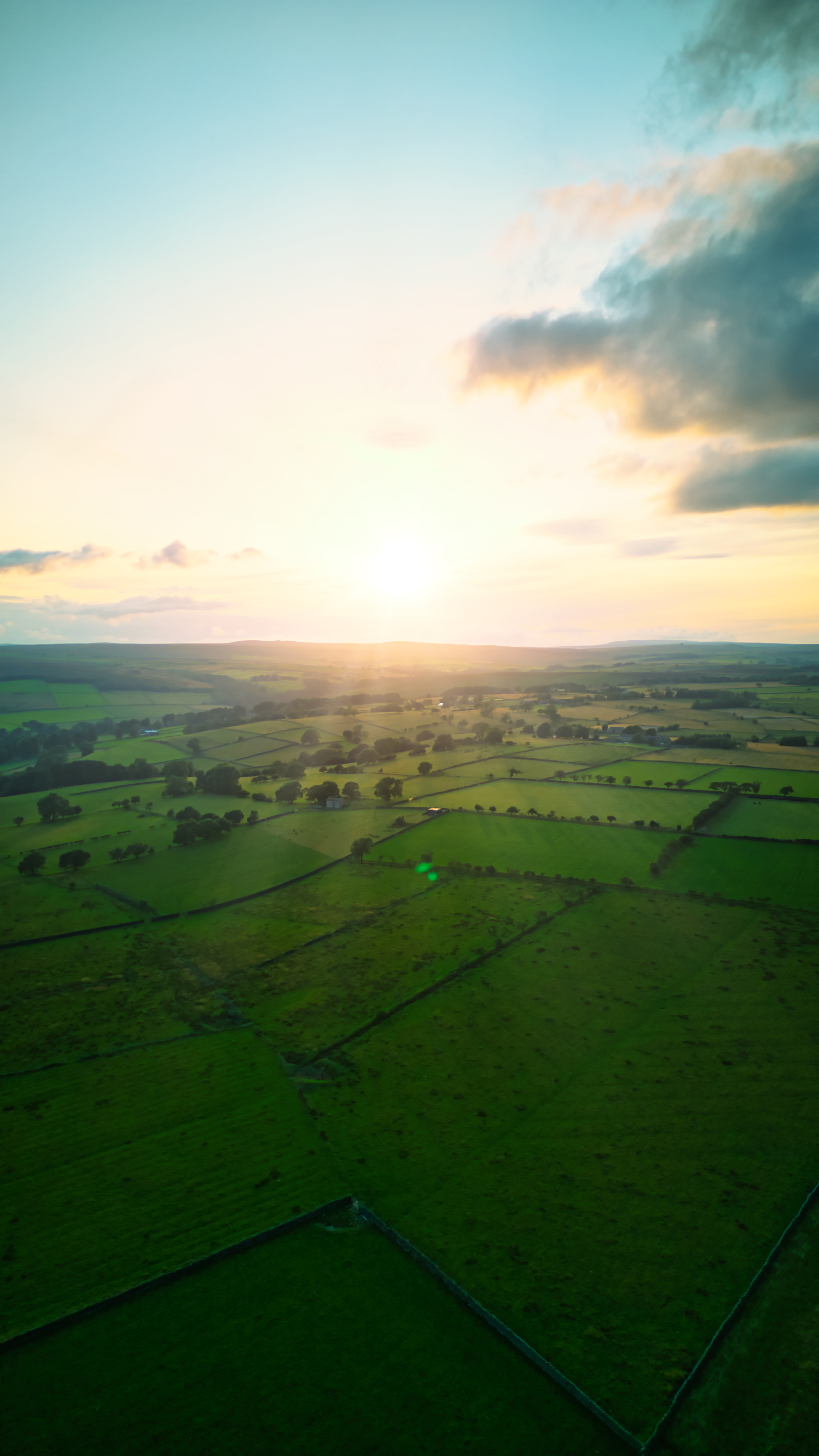 Aerial view of a lush countryside at sunset with vibrant green fields and a dramatic sky in Yorkshire.
