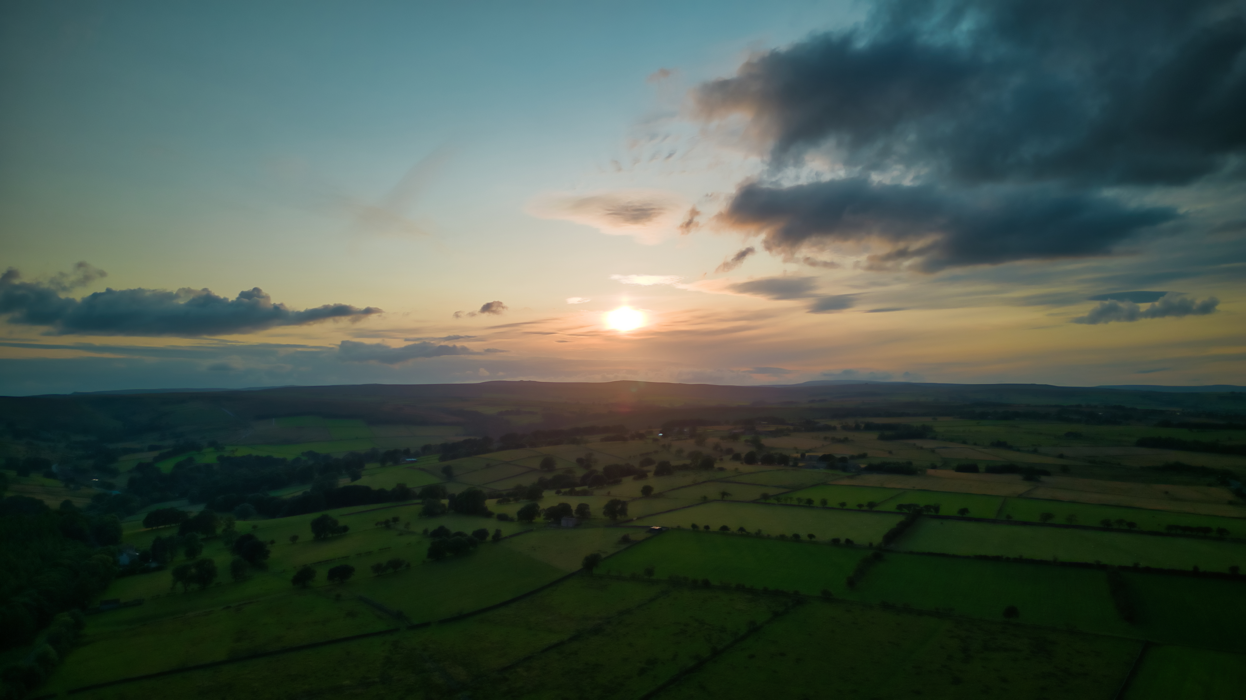 Aerial view of a lush countryside at sunset with vibrant green fields and a dramatic sky in Yorkshire.