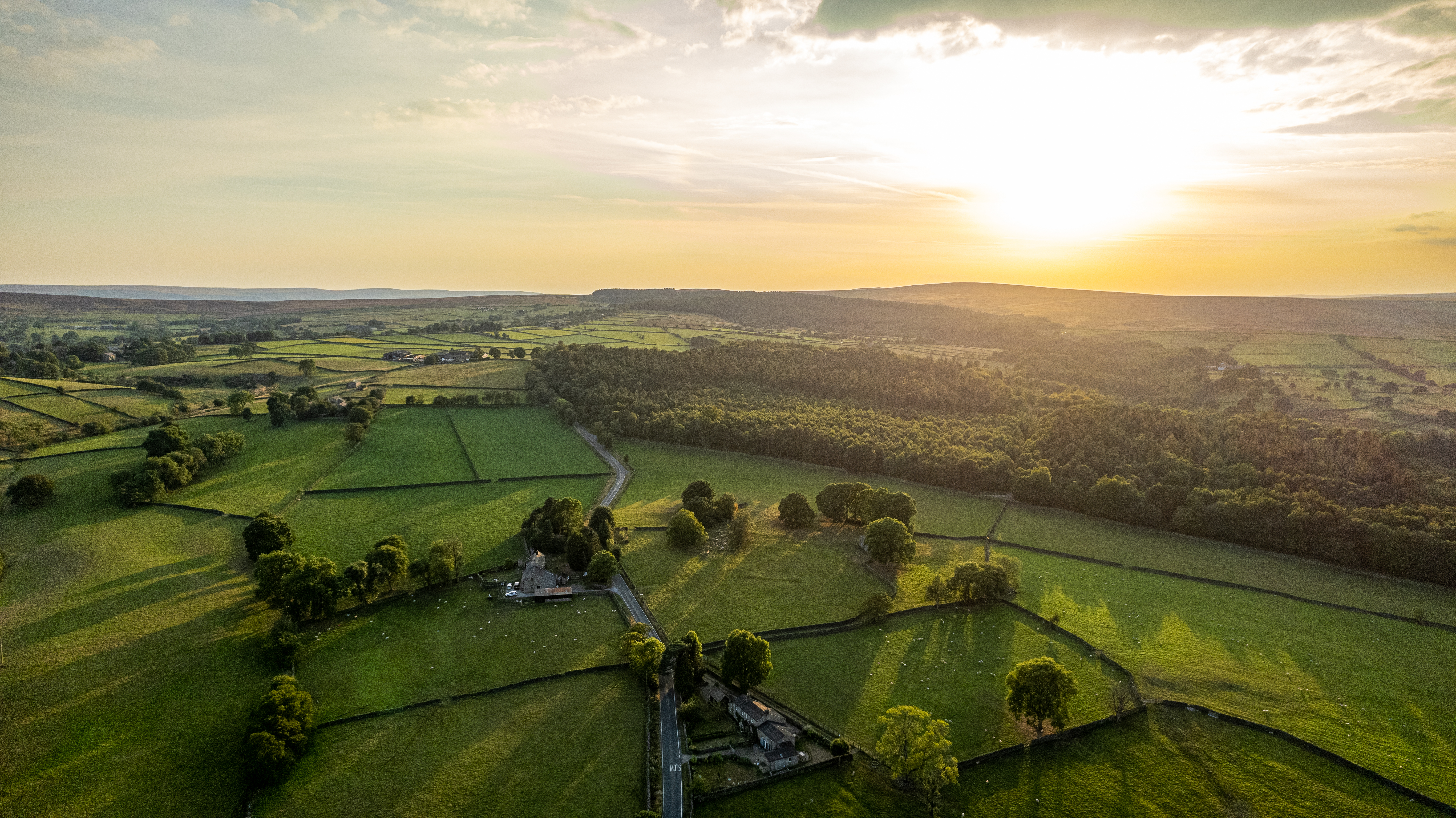 Aerial view of a lush countryside at sunset with vibrant green fields and a golden sky.