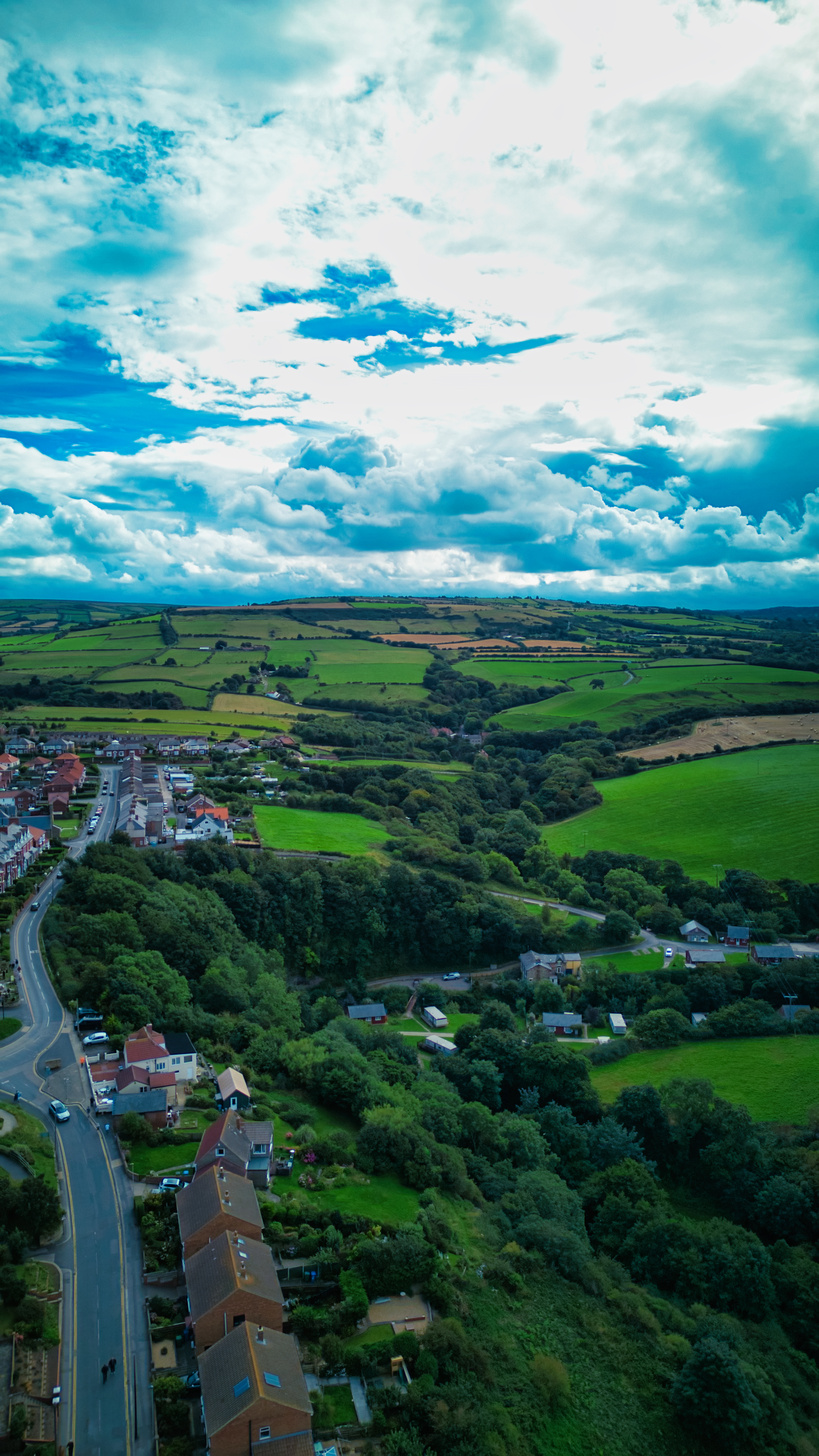 Aerial view of a lush countryside with a road leading through a small town under a dramatic sky in Staithes, England.