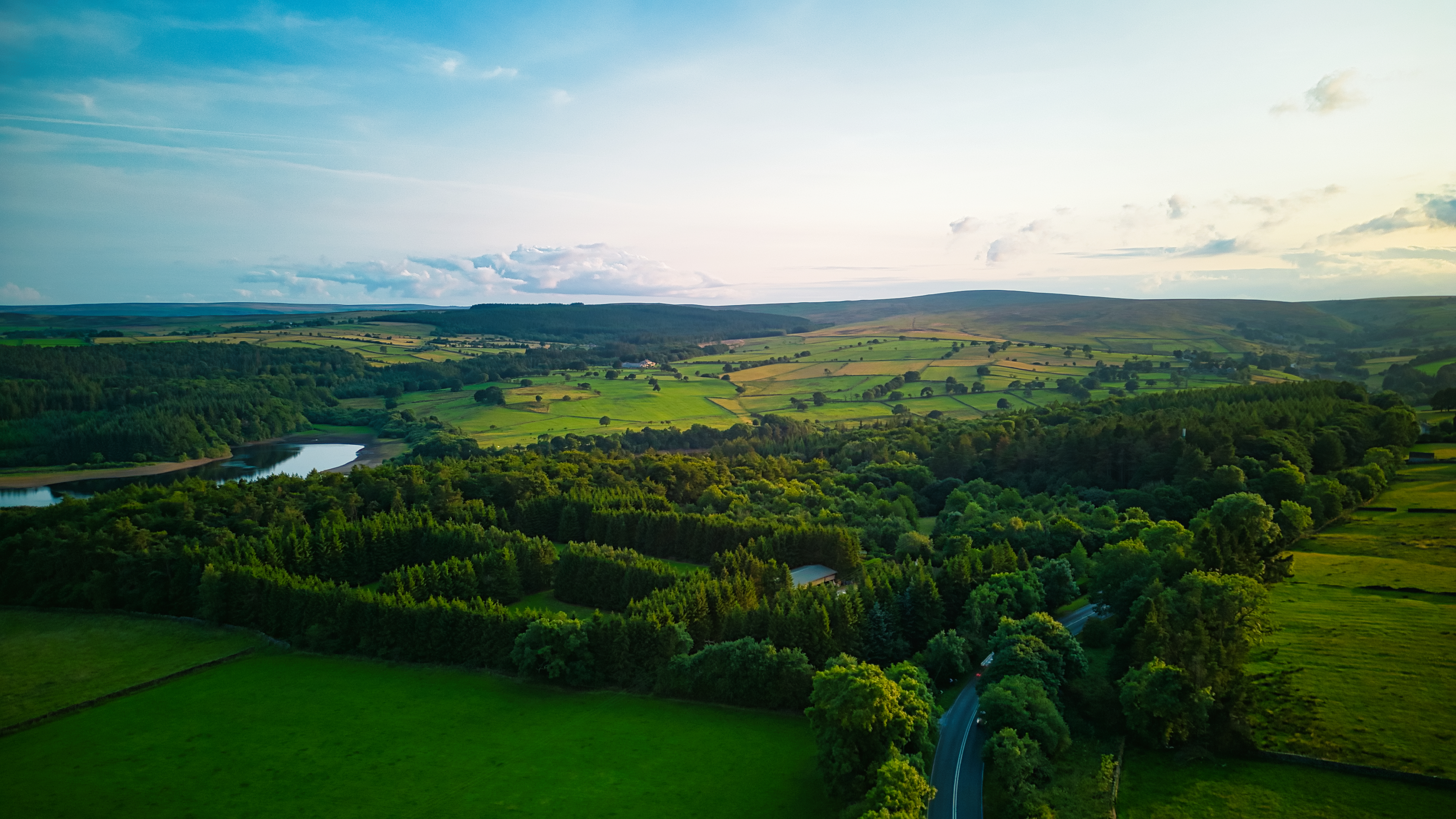 Aerial view of a lush countryside with a winding road, green fields, and a forest under a cloudy sky at sunrise in Yorkshire.