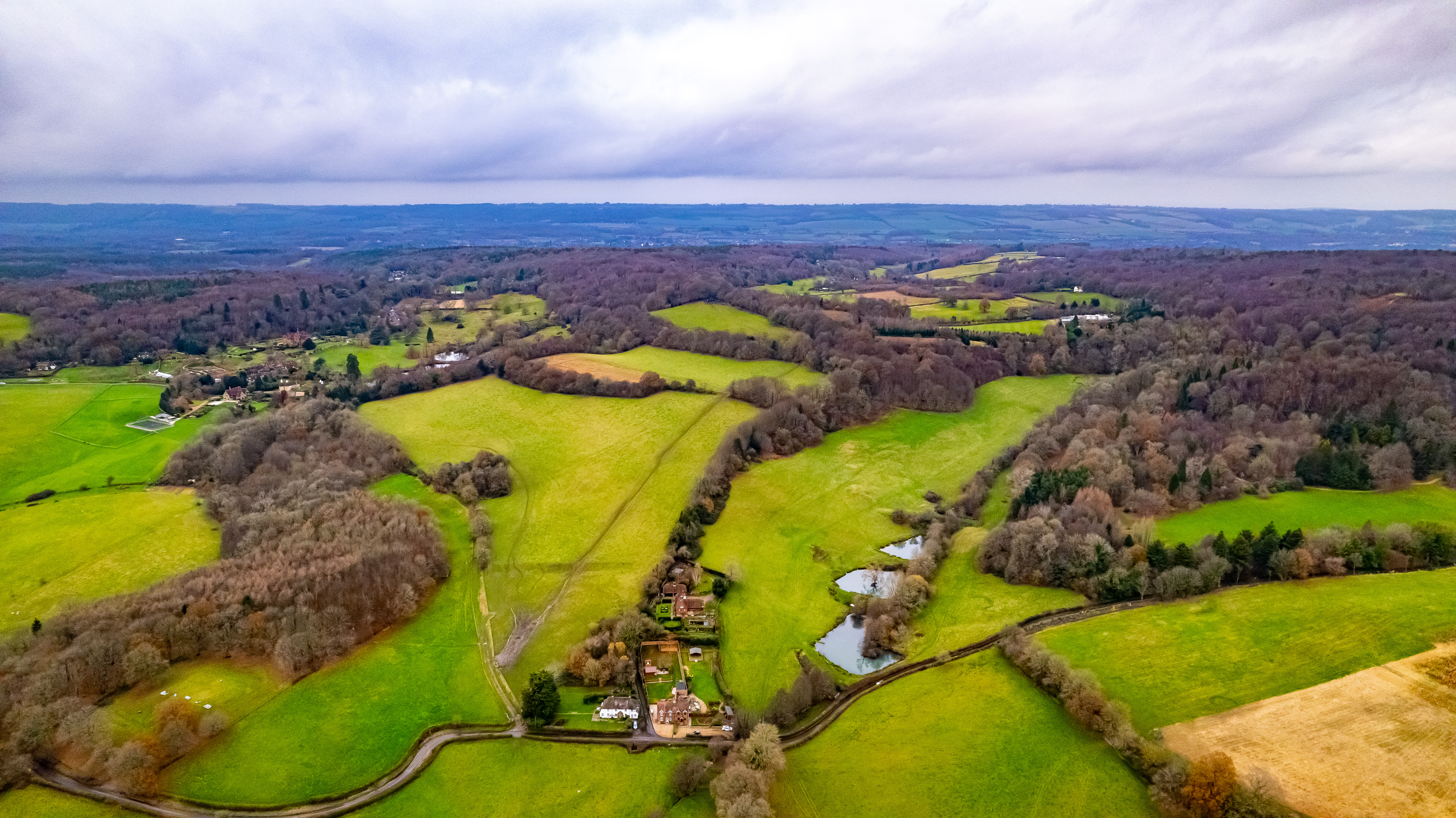 Aerial view of a lush countryside with green fields, trees, and a winding river under a cloudy sky.
