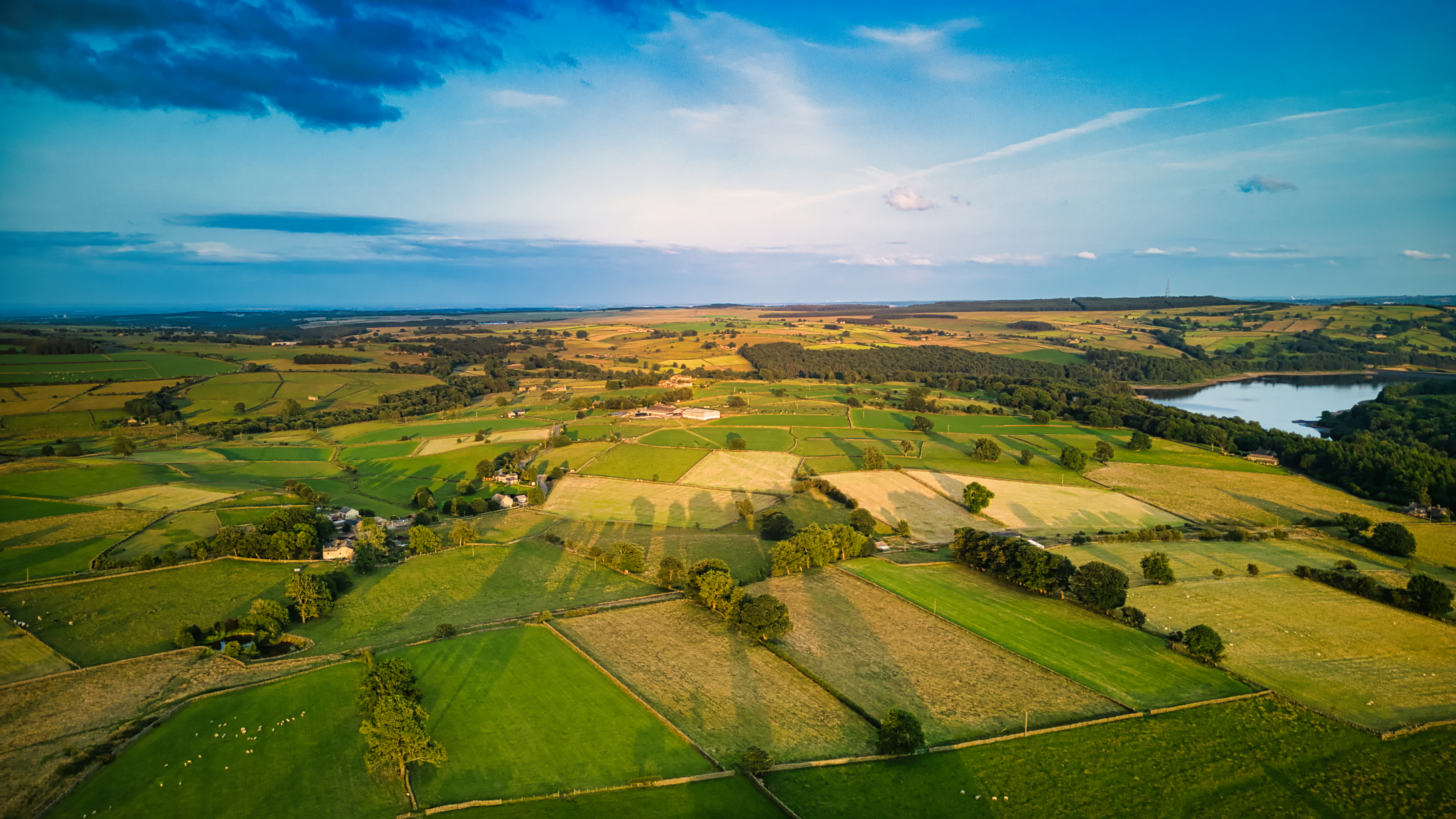 Aerial view of a lush countryside with patchwork fields, trees, and a lake under a blue sky with scattered clouds in Yorkshire.