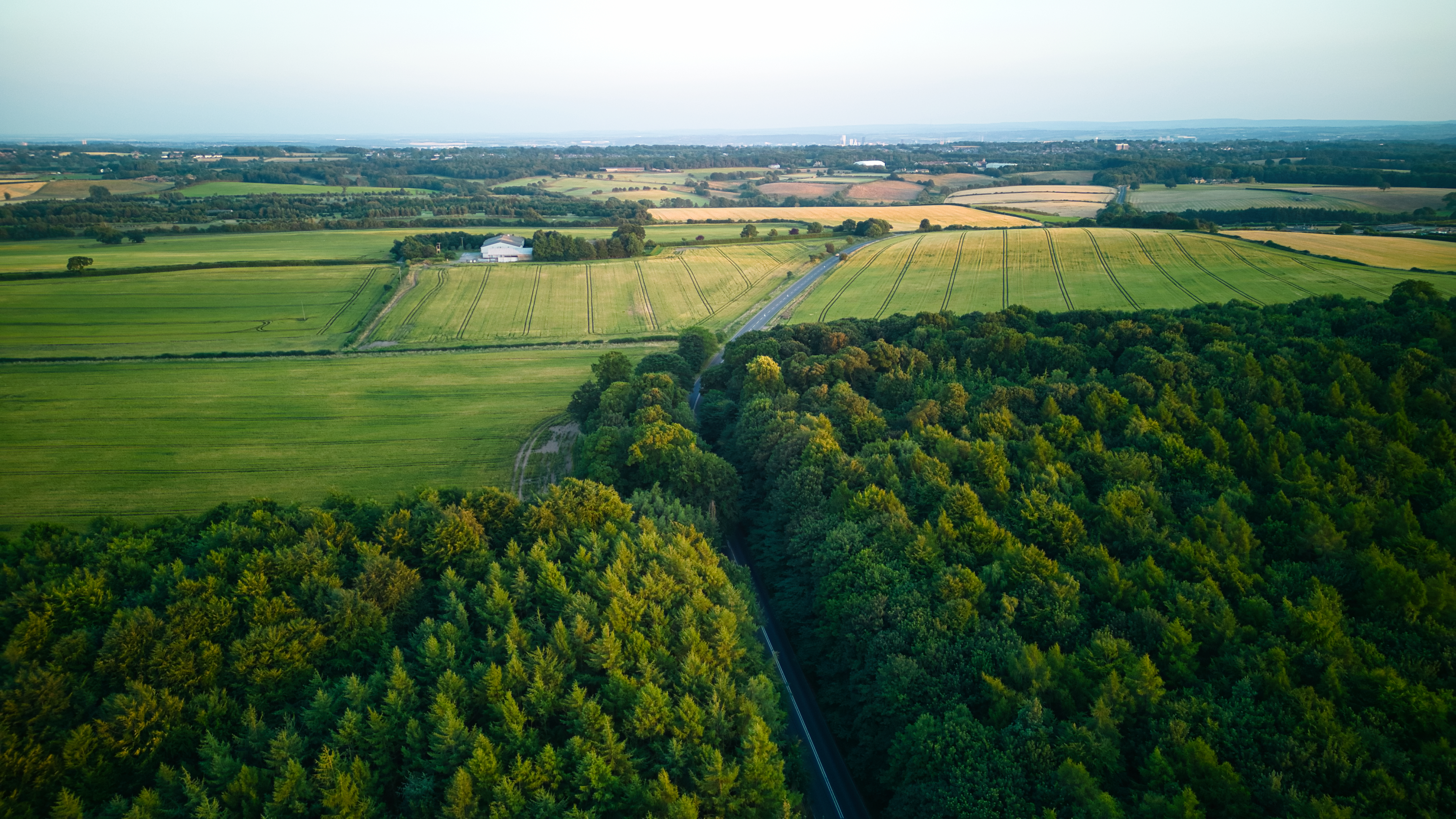 Aerial view of a lush forest with a road cutting through, under a clear blue sky at dusk in Yorkshire.