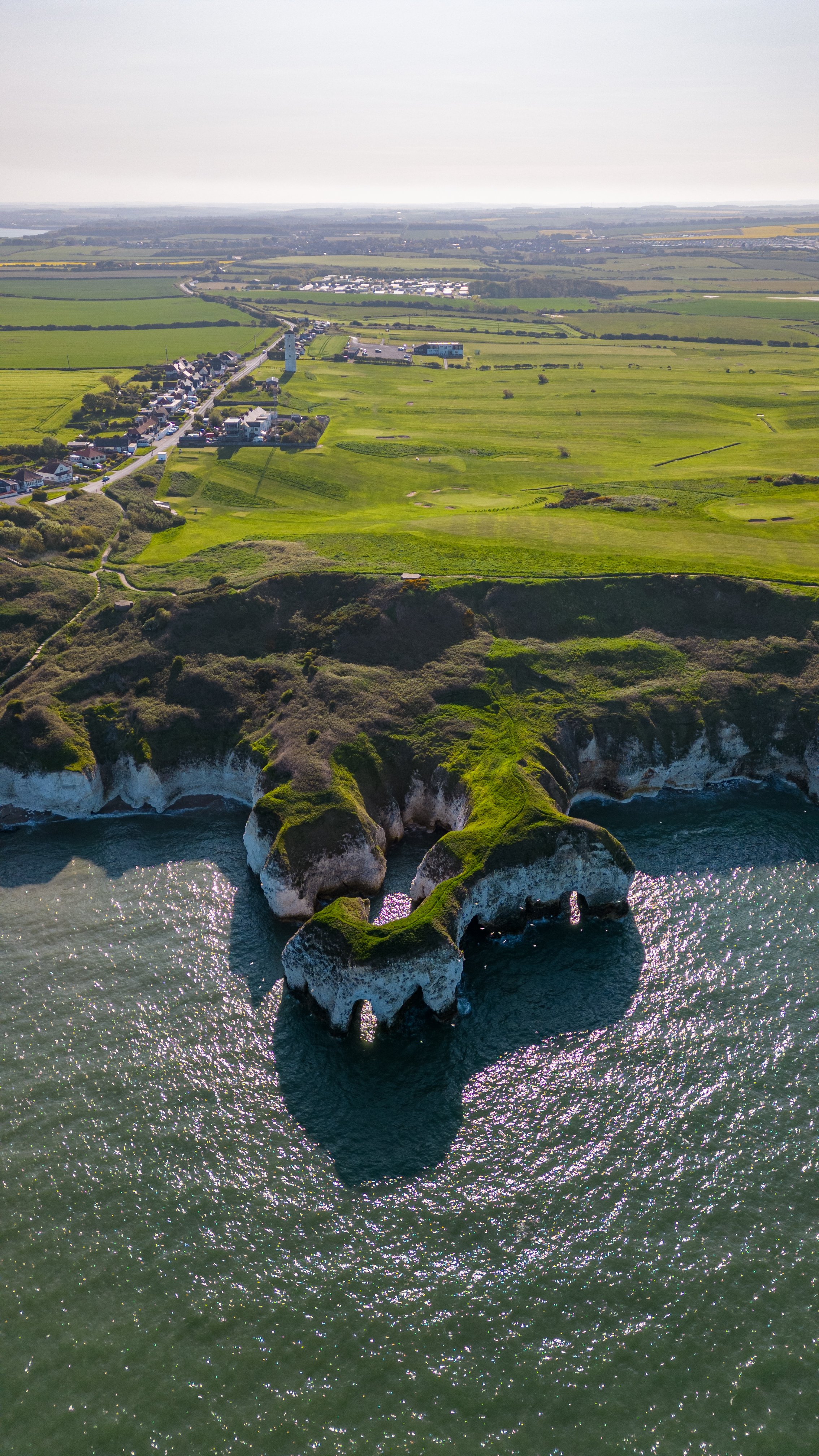 Aerial view of a lush green coastal landscape with cliffs and sea in Flamborough, England