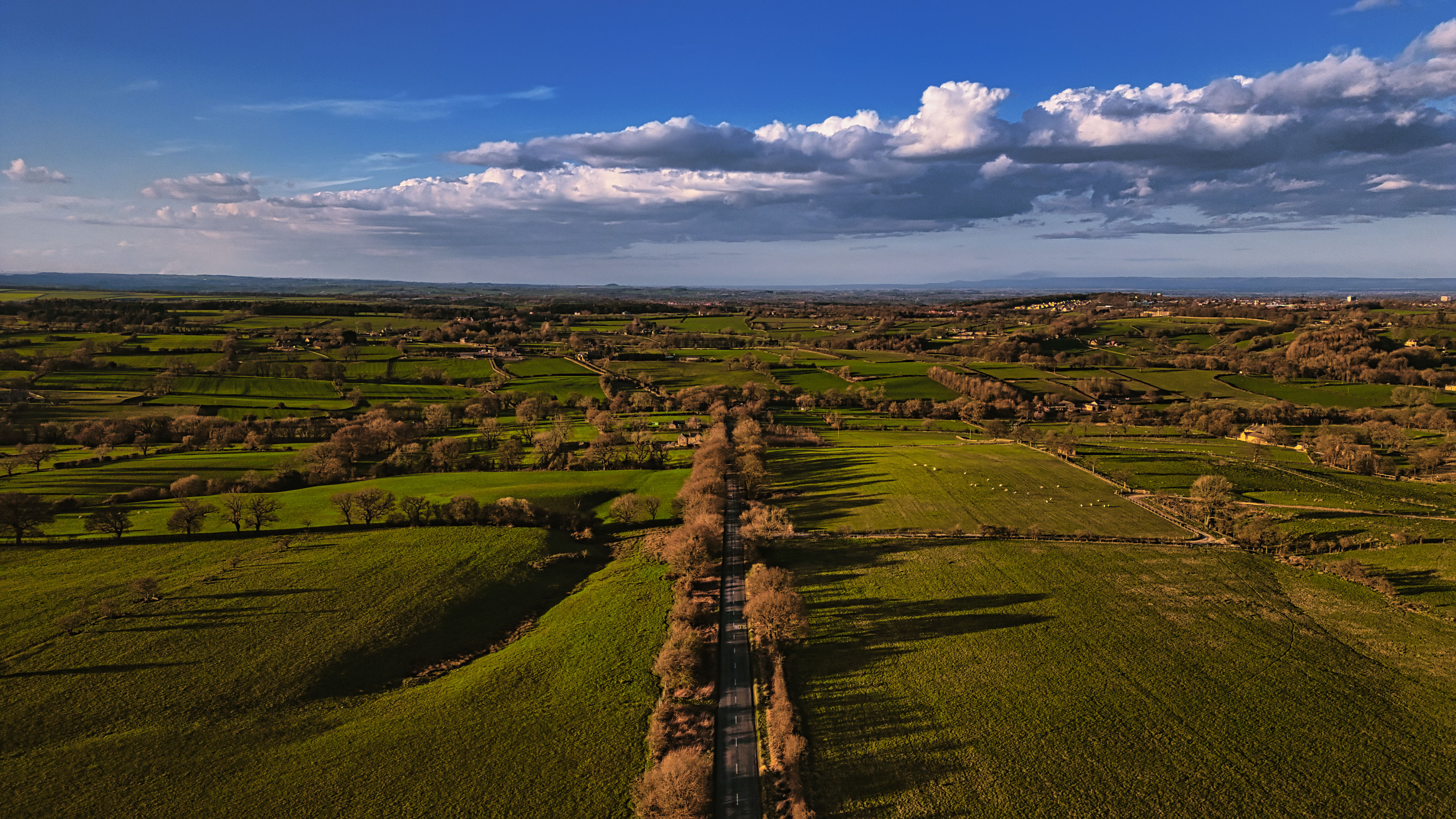 Aerial view of a lush green countryside with a road cutting through, under a vast blue sky with scattered clouds in North Yorkshire.