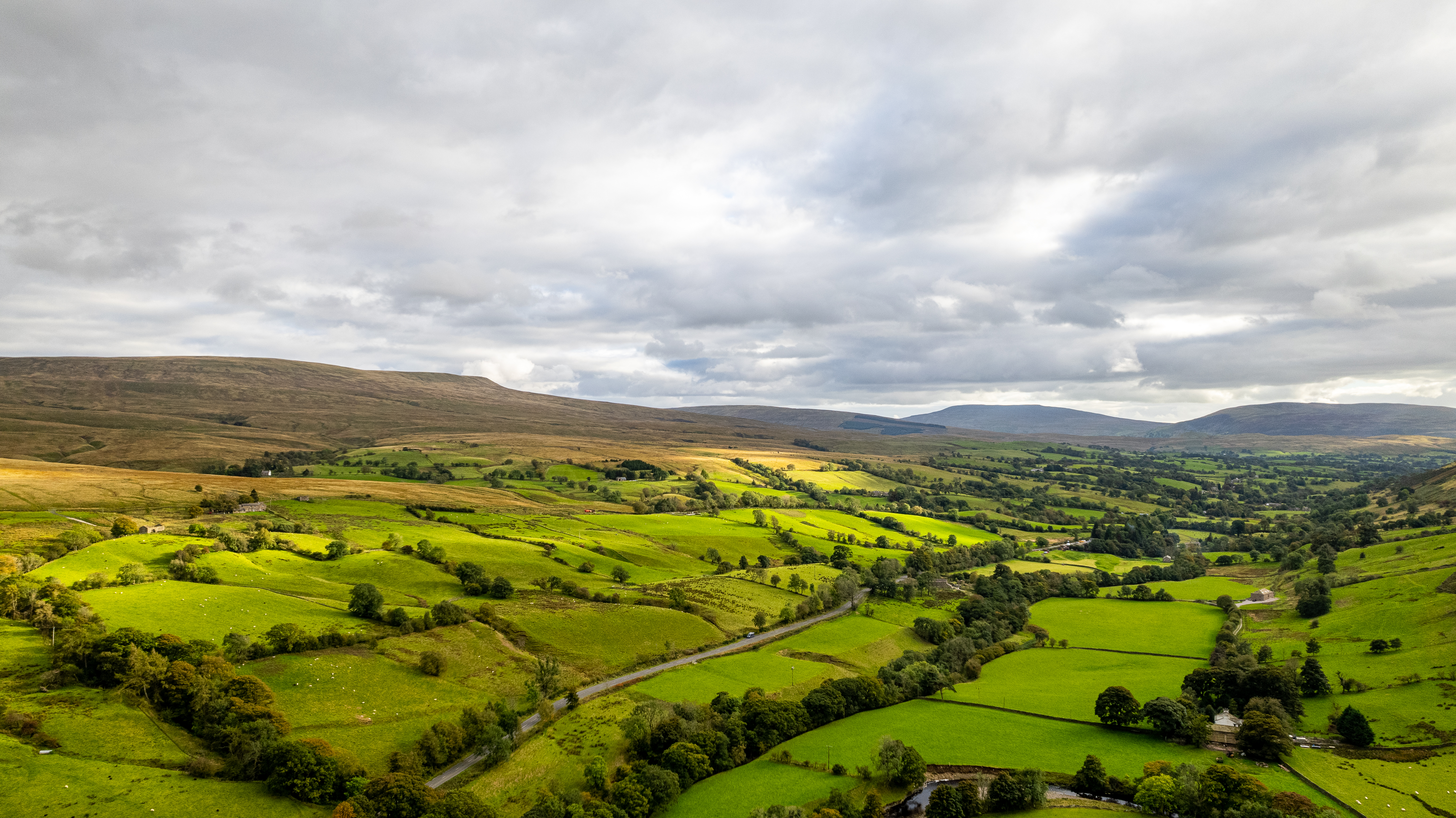 Aerial view of a lush green countryside with patchwork fields under a cloudy sky.